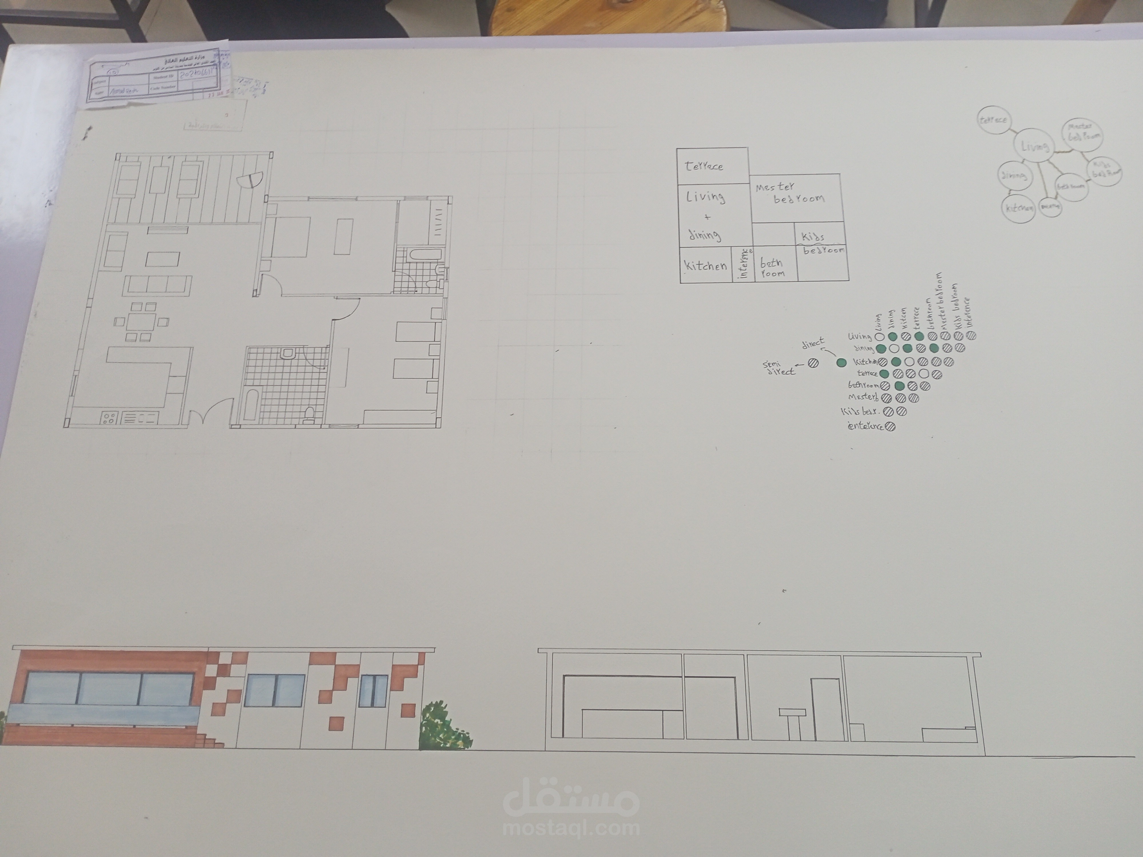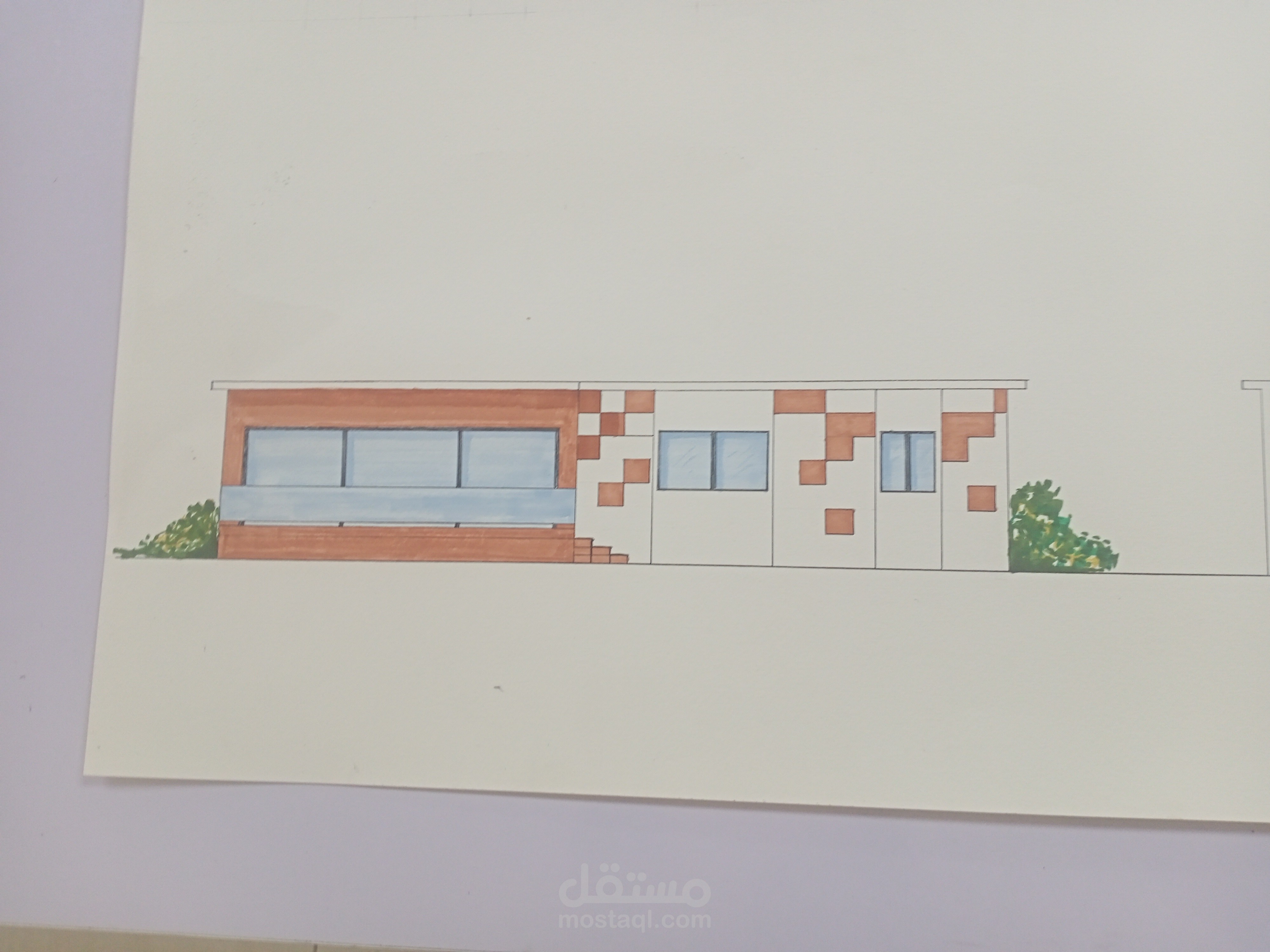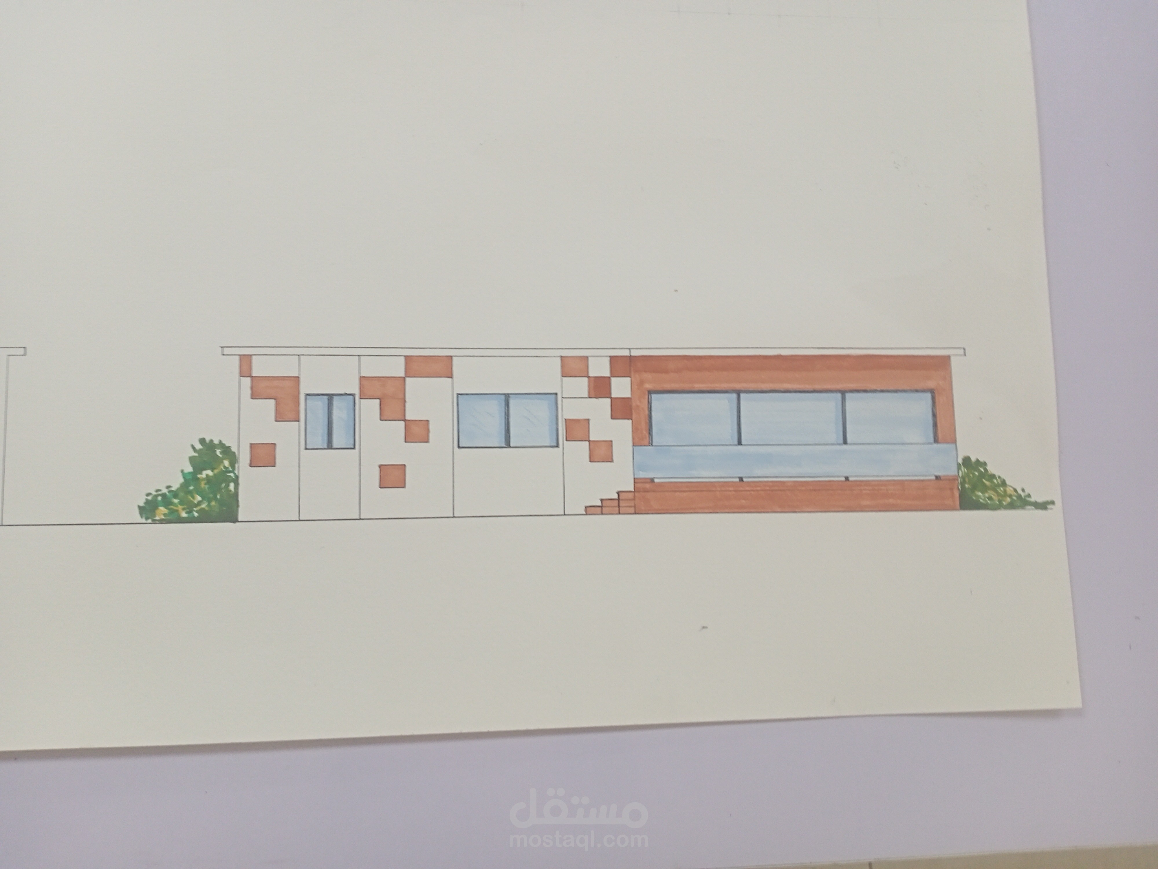 شالية على مساحة 90 متر مكون من غرفة معيشة و صفرة و مطبخ و تيراس كبير نسبيا و غرفتين منهم واحدة ماستر و حمام و التصميم به خصوصية و و المدخل من الجنوب و فتحات كبيرة و التيراس باتجاه الشمال لكى يطل ع البحر