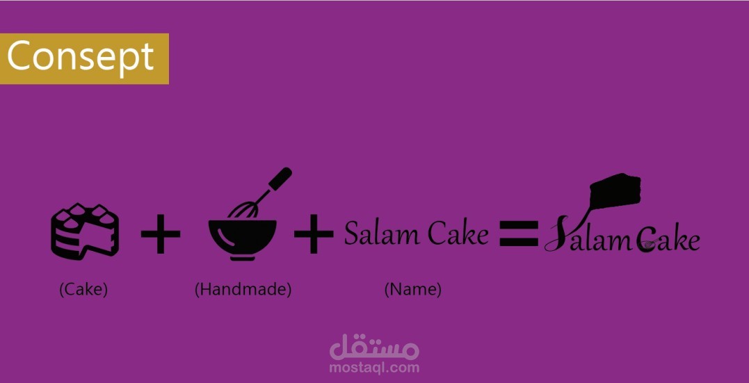ولتنفيذ الفكرة تم دمج ايقونة تدل على الكيك مع حرف S في اسم salam مع التغير البسيط في الحروف وتم دمج خفاقة كيك يدوية مع حرف C في كلمة Cake للدلالة على ان الكيك صناعة يدوية مع التغير البسيط في الحروف