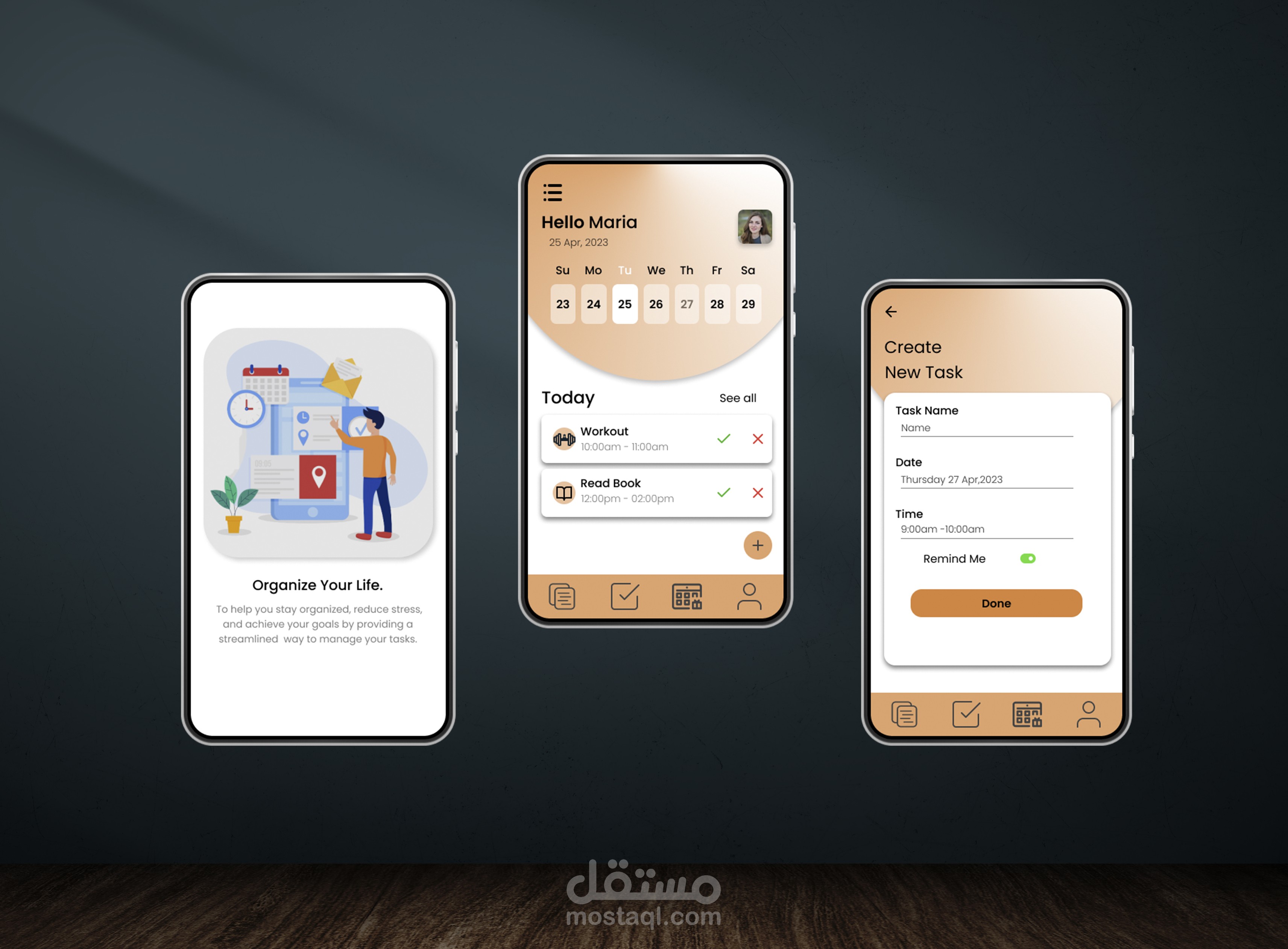 2-تقسيم الواجهة إلى أجزاء: يجب تقسيم الواجهة إلى أجزاء منفصلة تشمل مهام اليوم والمستقبل والمهام المكتملة. يجب أن تكون المهام المهمة والعاجلة أكثر وضوحًا وتحديدها بالألوان المميزة.