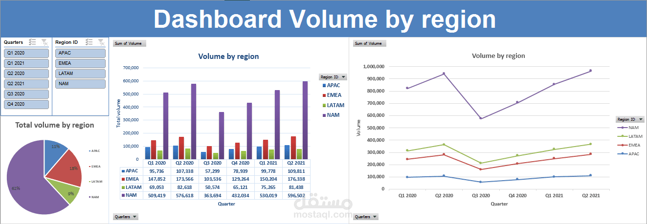 تحليل و عرض بيانات بإستخدام مايكروسوفت إكسيل بدقة و إحترافية لإستخراج حجم المبيعات لكل منطقة عن كل ربع سنة و الإجابة على جميع أسئلة العميل .