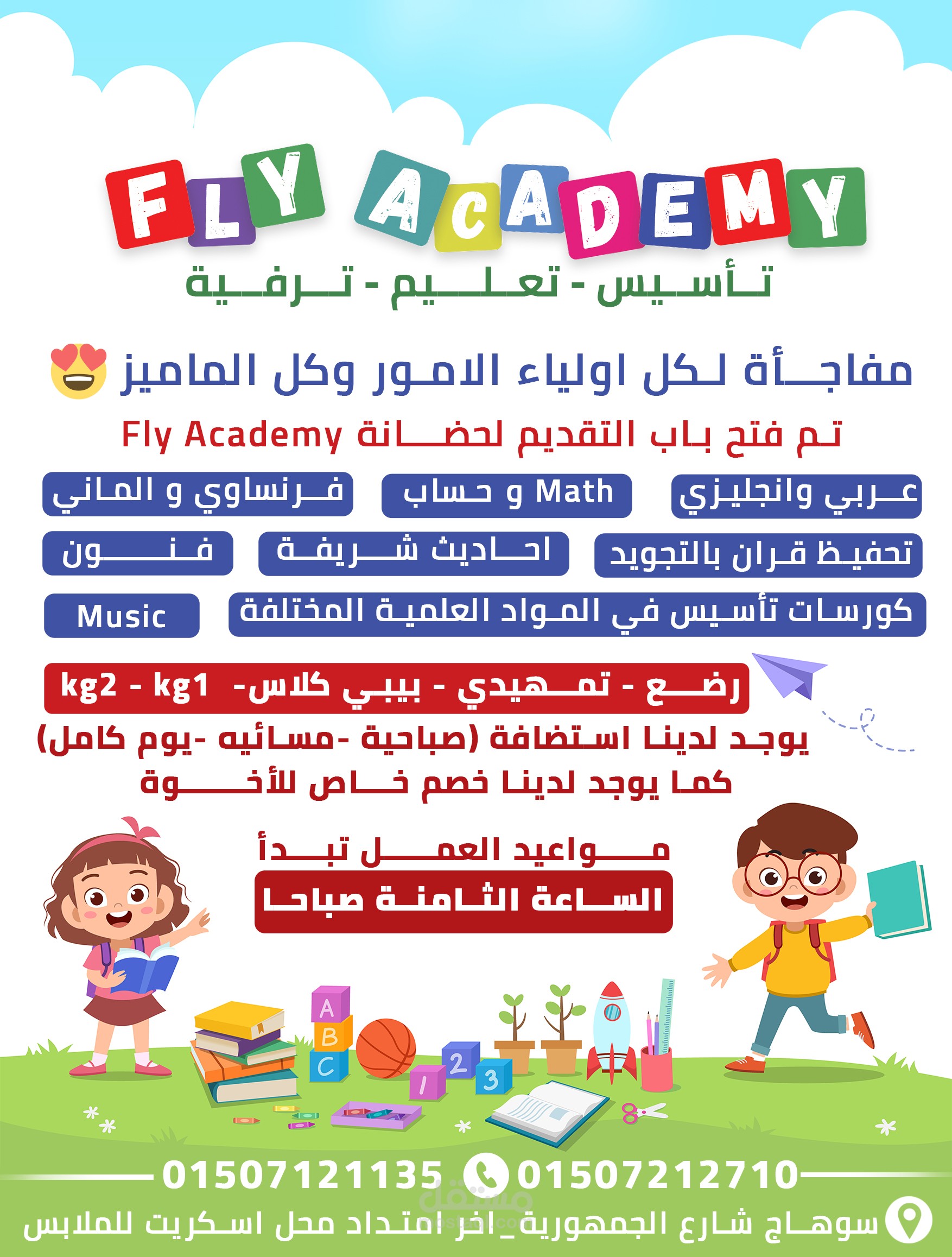 فلاي اكاديمي هي حضانة ونادي صيفي للاطفال تقدم ايضا تدريبات وكورسات في مجالات مختلفة من الفنون..