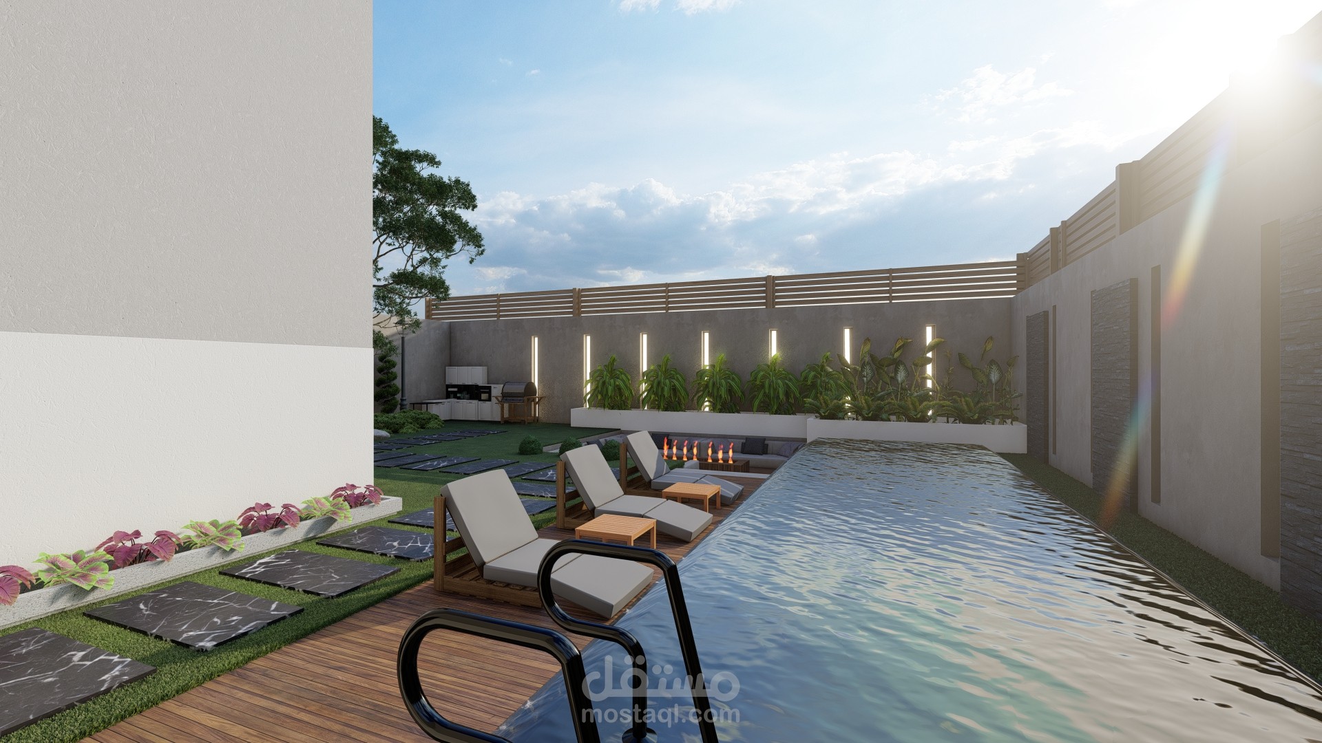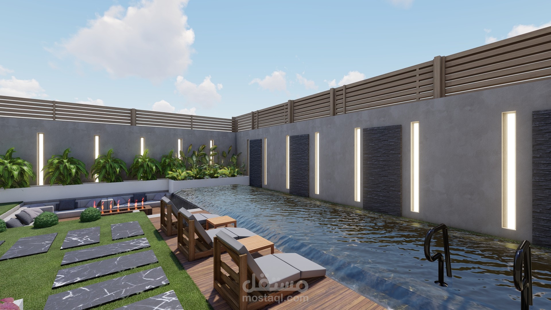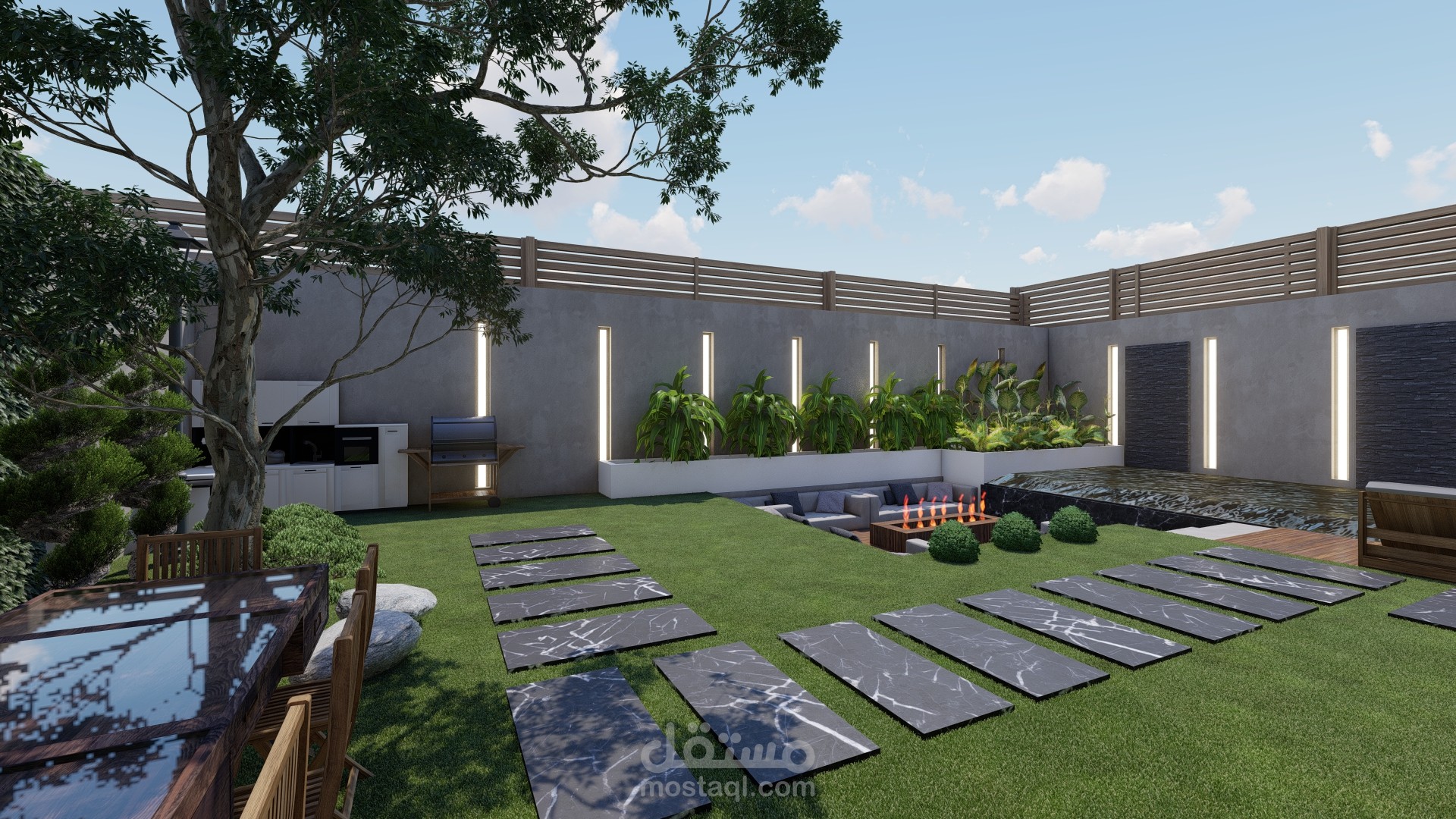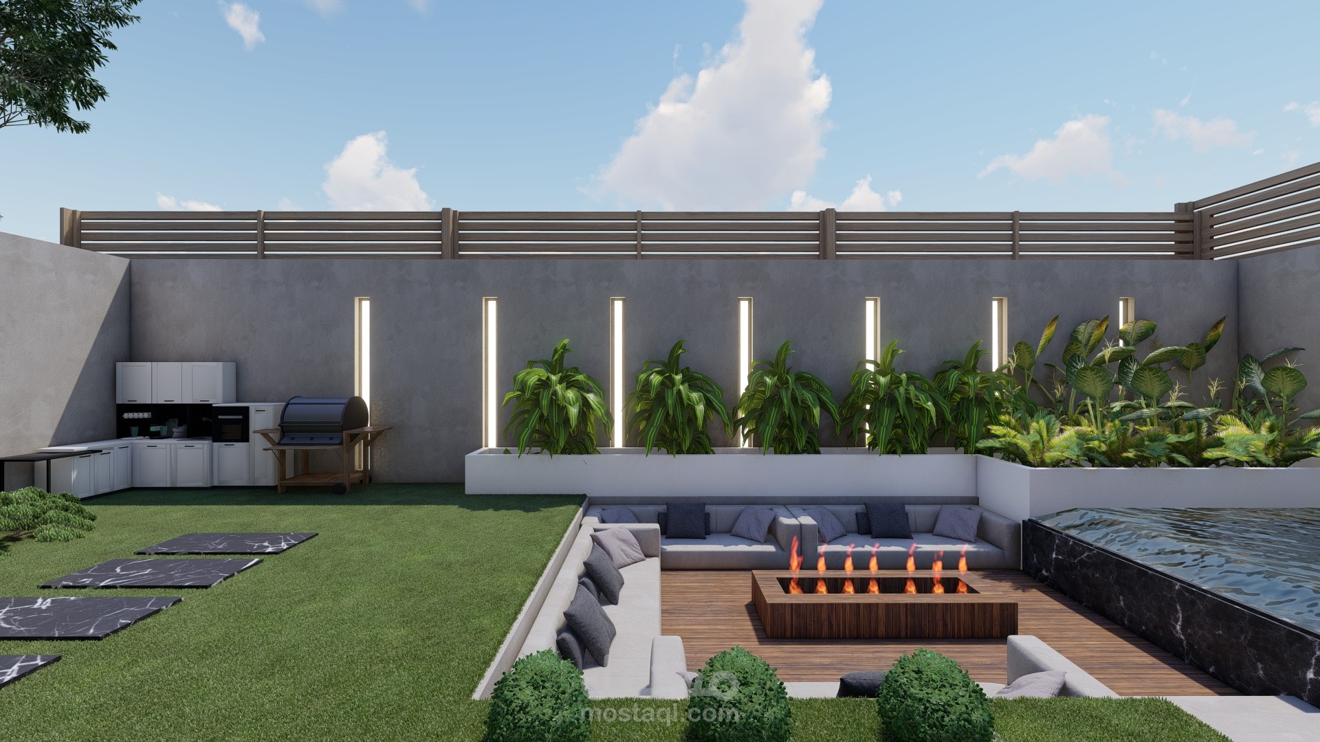 تصميم لاند سكيب لحديقة مزرعة في الامارات منطقة الباهية تحتوي على مسبح وركن استراحة و باربكيو و جلسات و ركن طعام و مساحات خضراء و مناطق لزراعة النباتات المفضلة