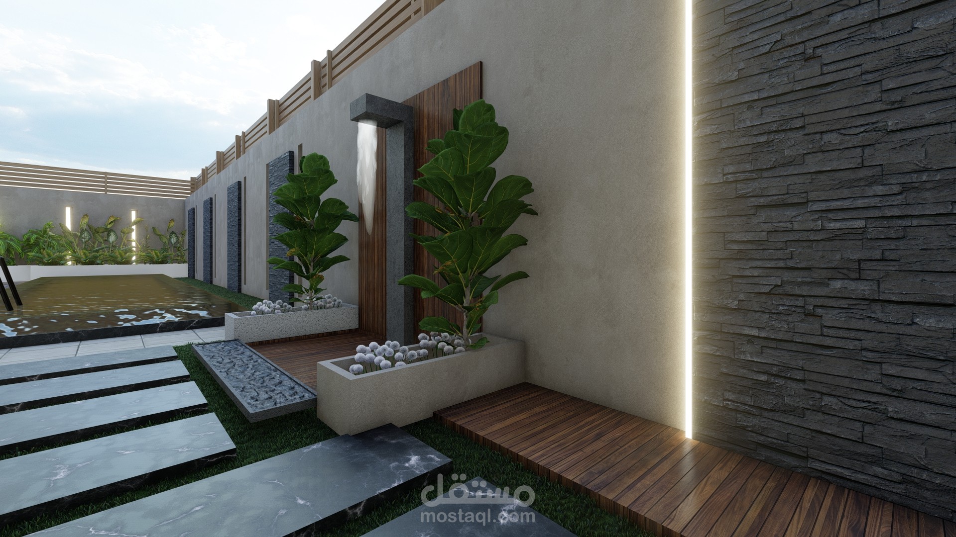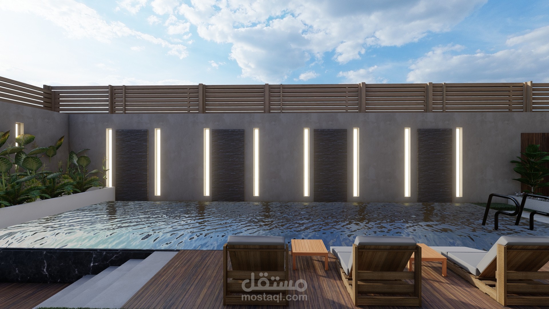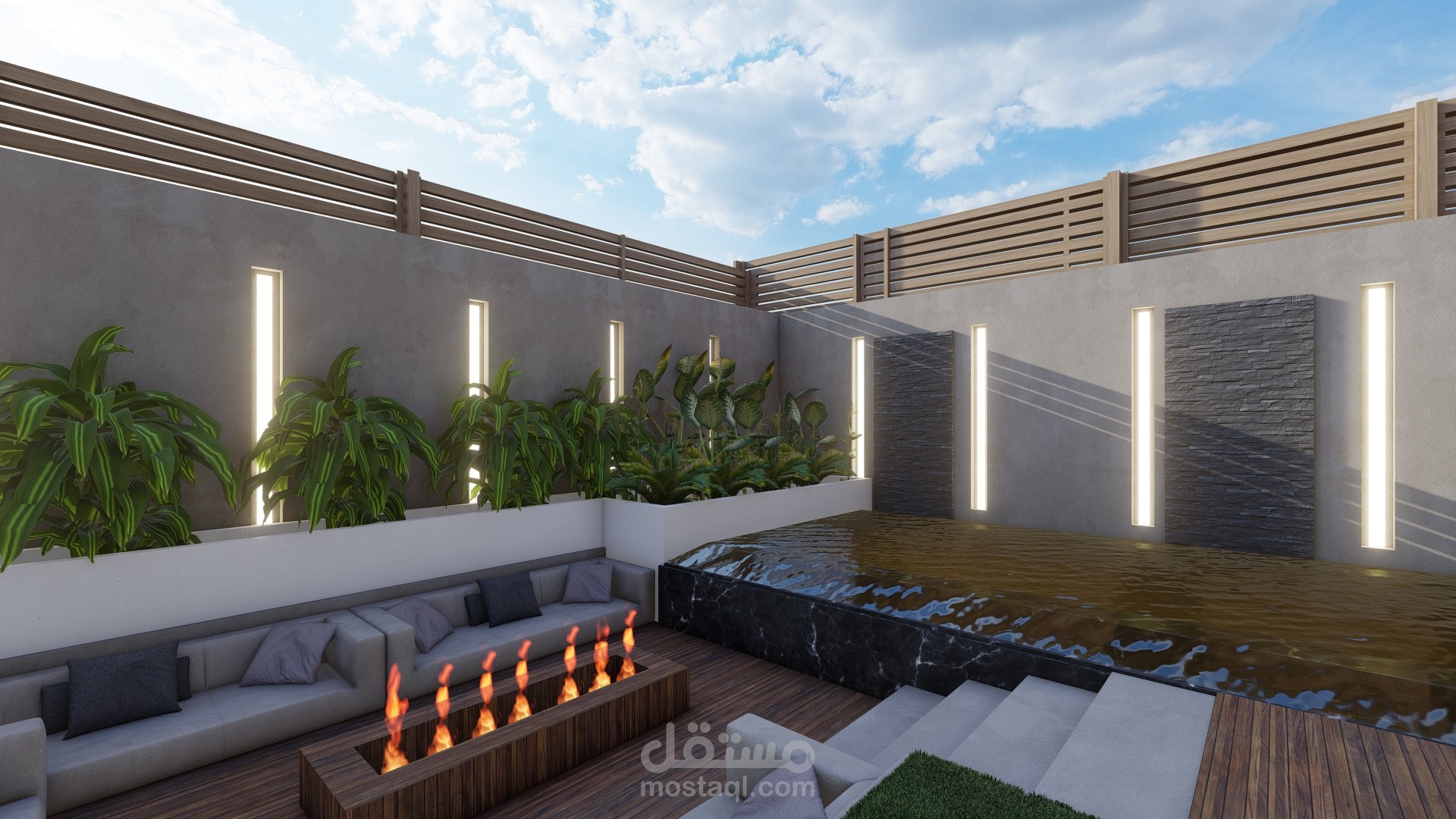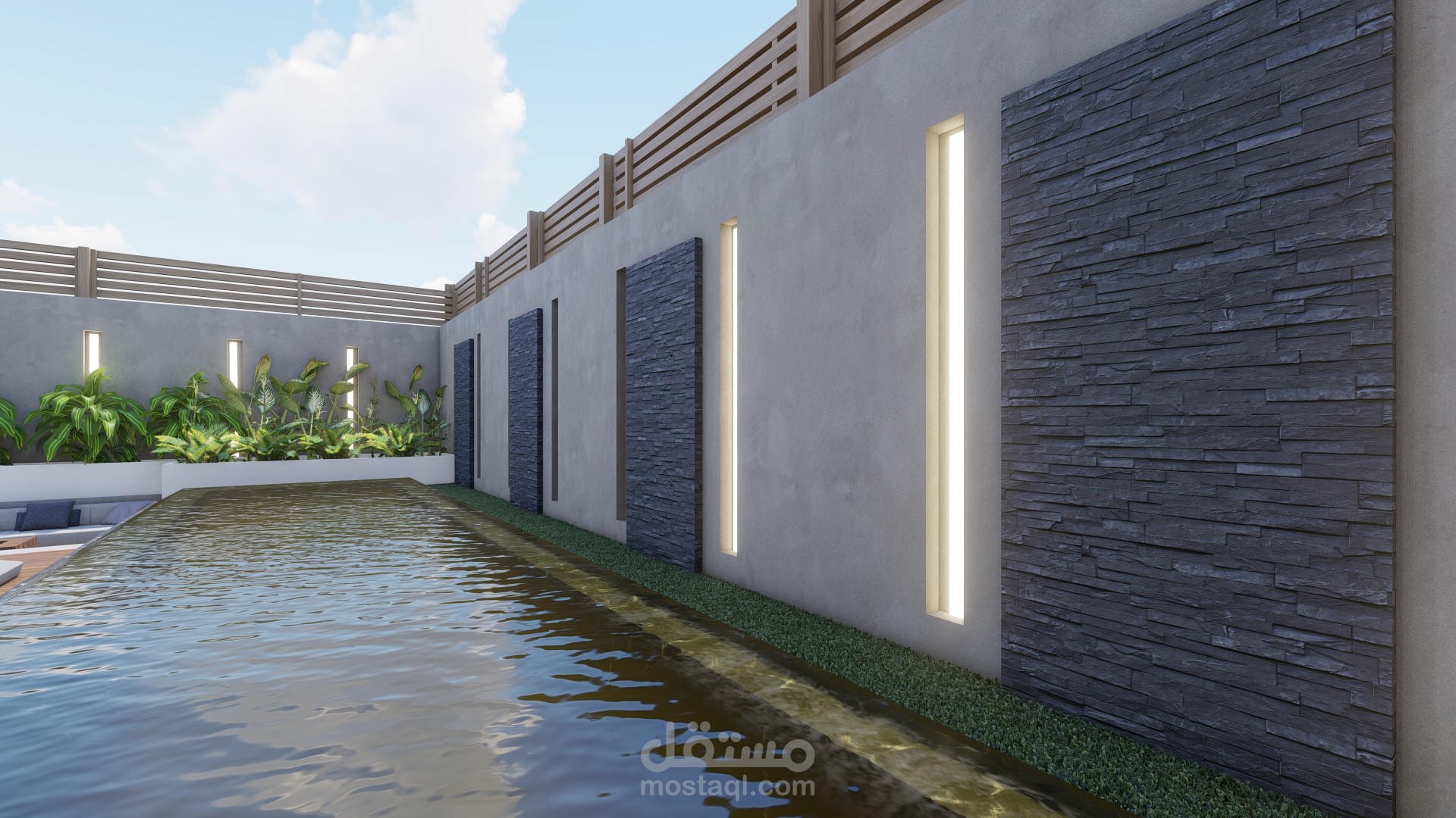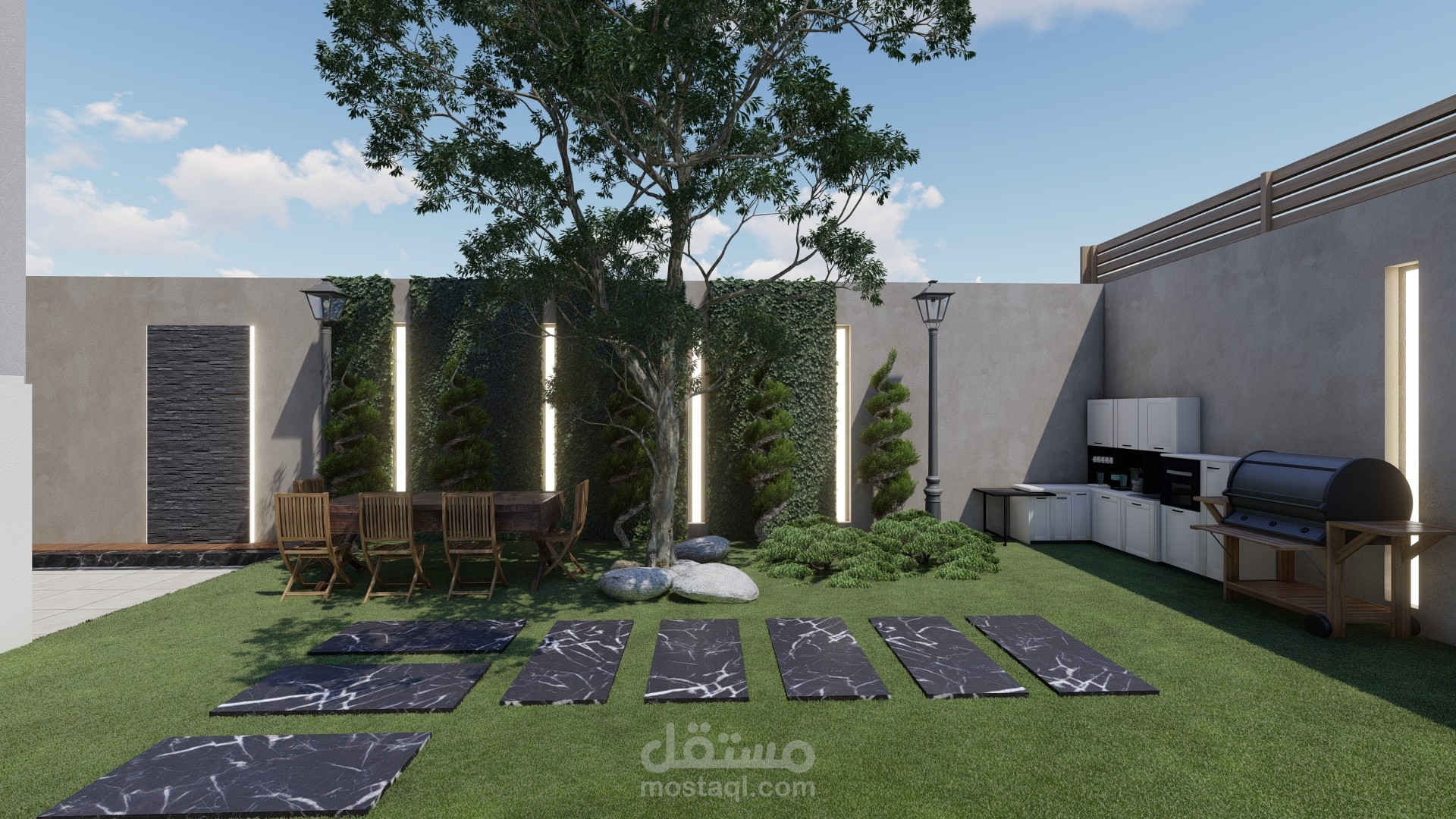 تصميم لاند سكيب لحديقة مزرعة في الامارات منطقة الباهية تحتوي على مسبح وركن استراحة و باربكيو و جلسات و ركن طعام و مساحات خضراء و مناطق لزراعة النباتات المفضلة