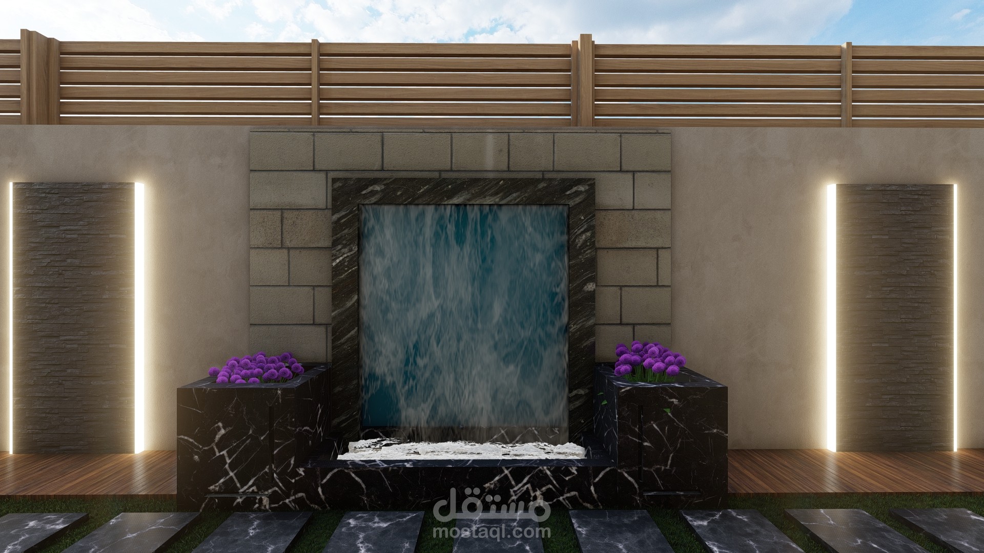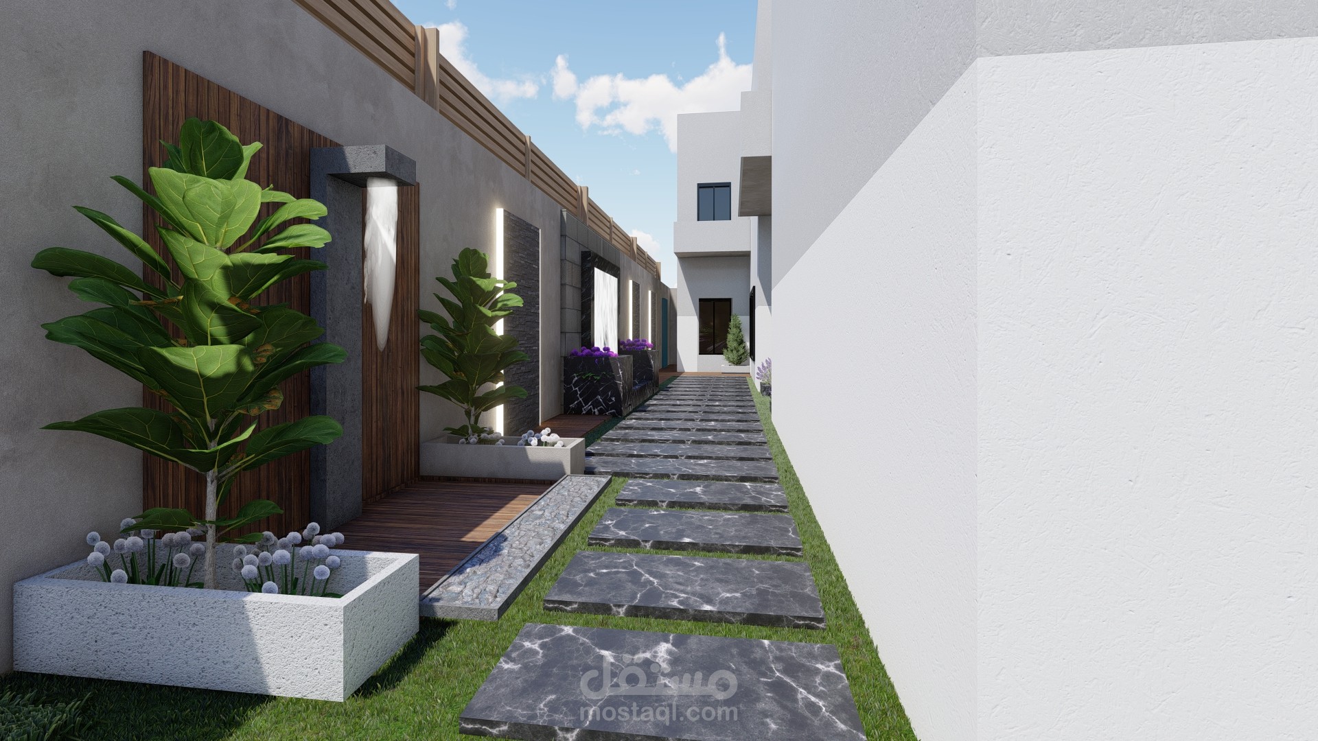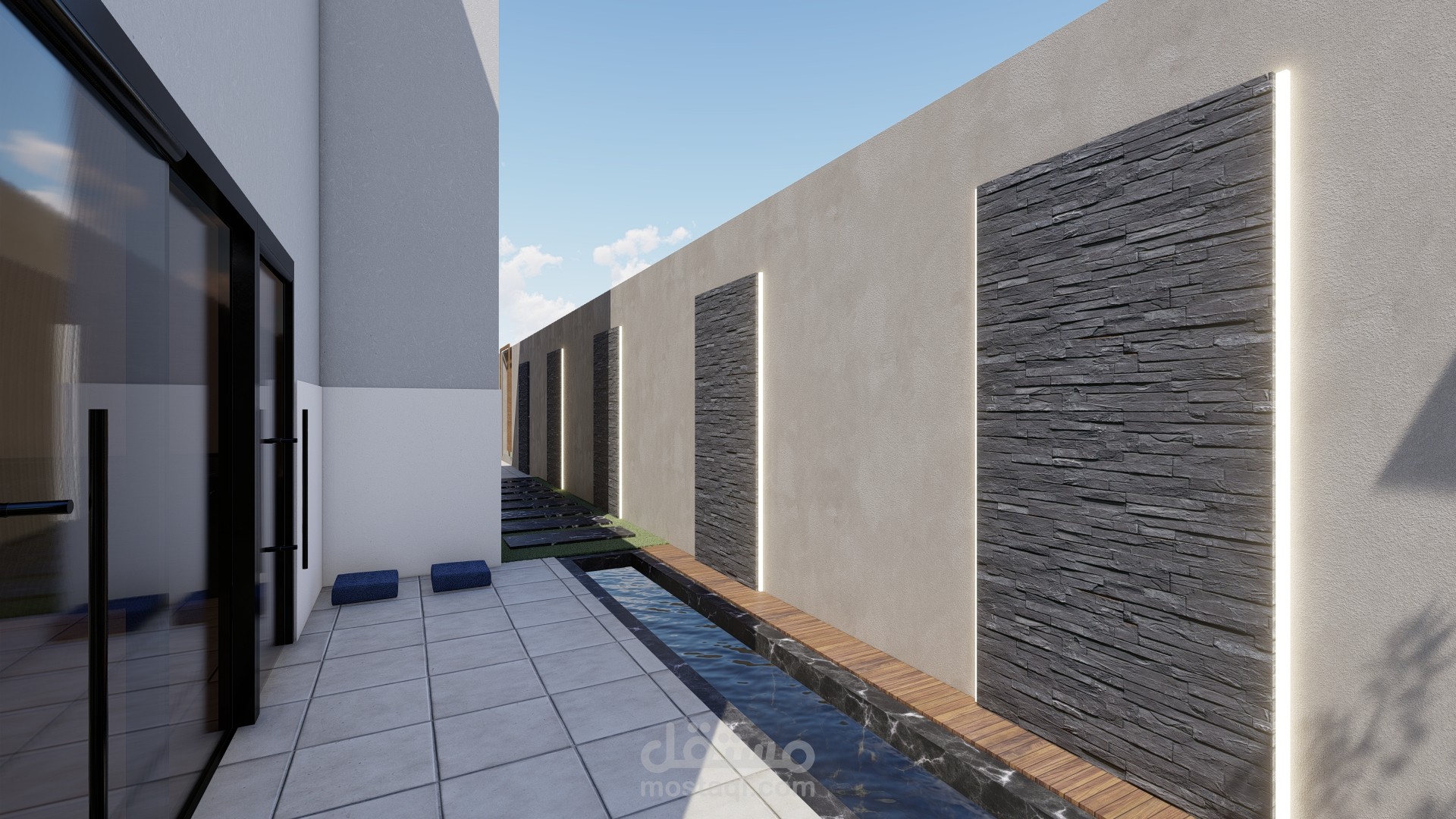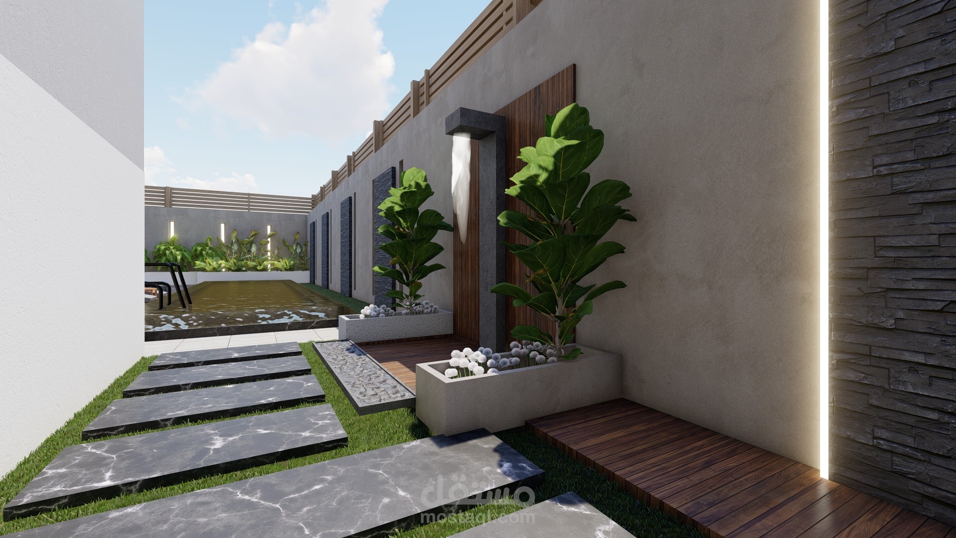 تصميم لاند سكيب لحديقة مزرعة في الامارات منطقة الباهية تحتوي على مسبح وركن استراحة و باربكيو و جلسات و ركن طعام و مساحات خضراء و مناطق لزراعة النباتات المفضلة