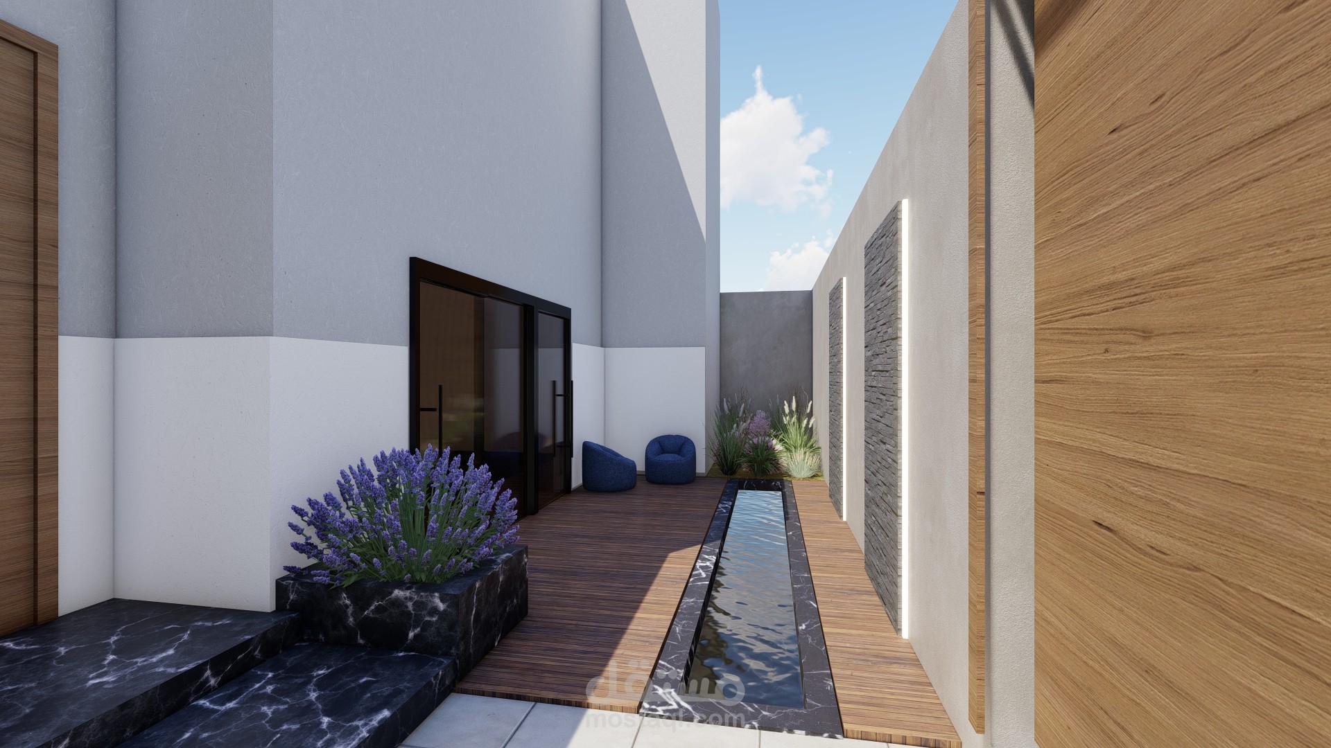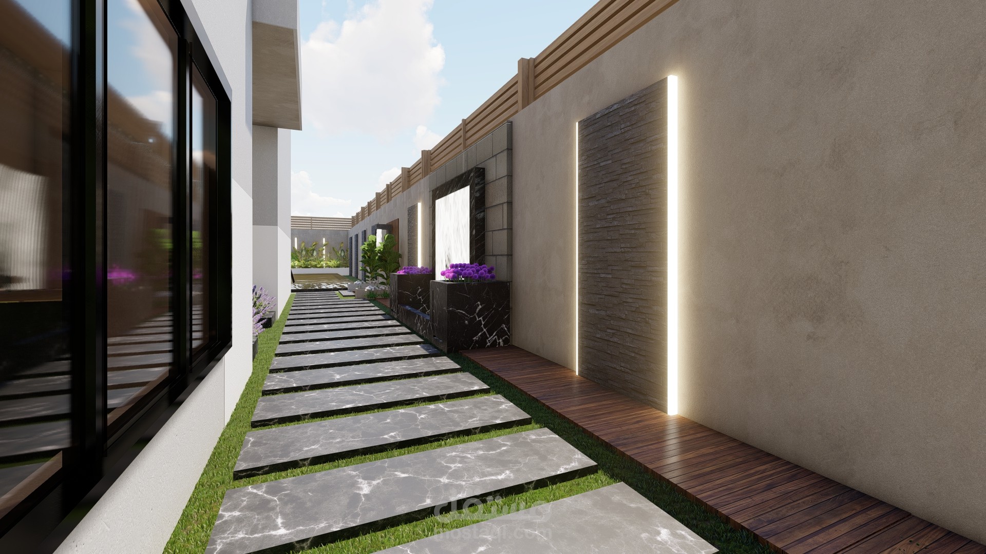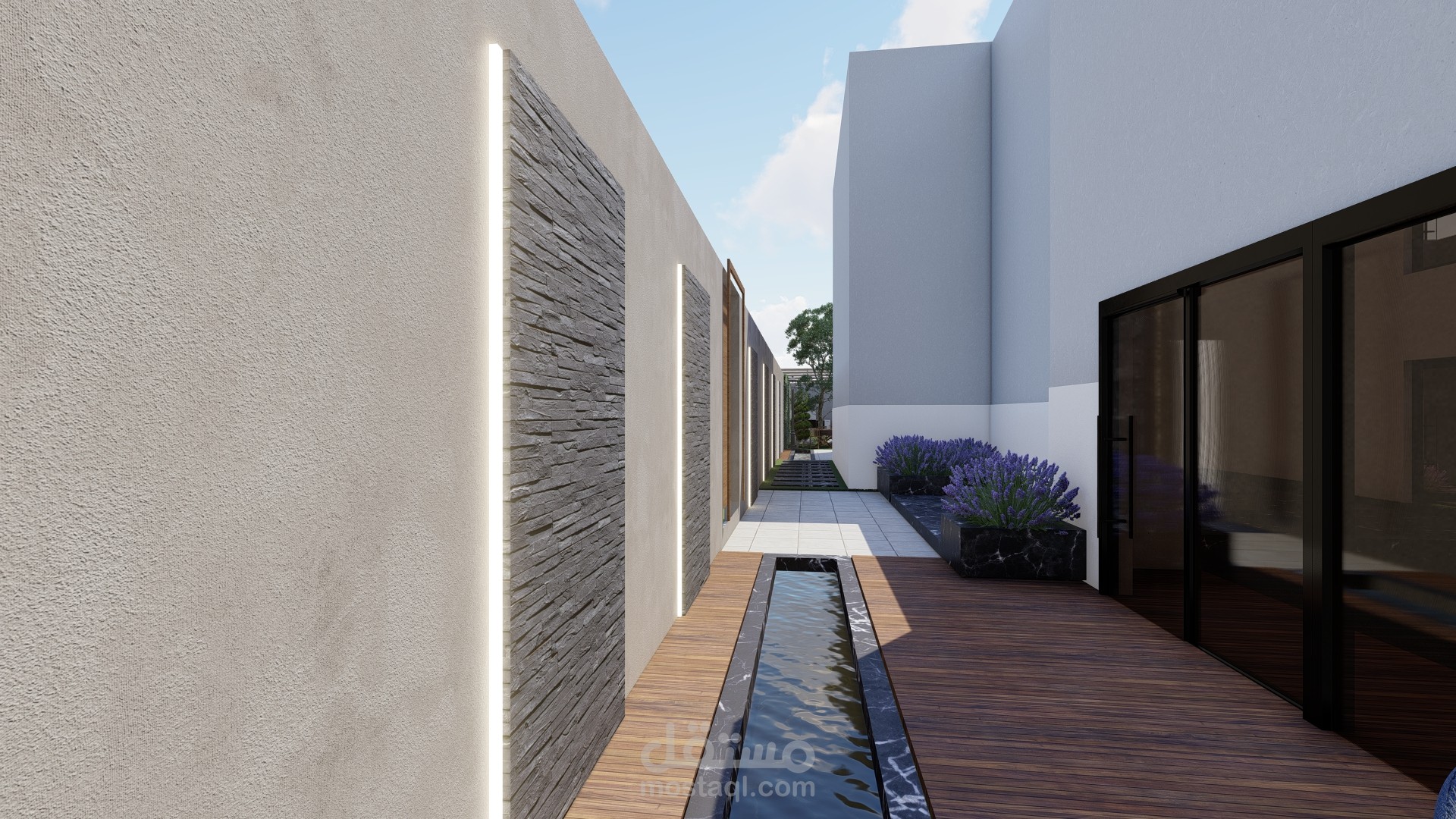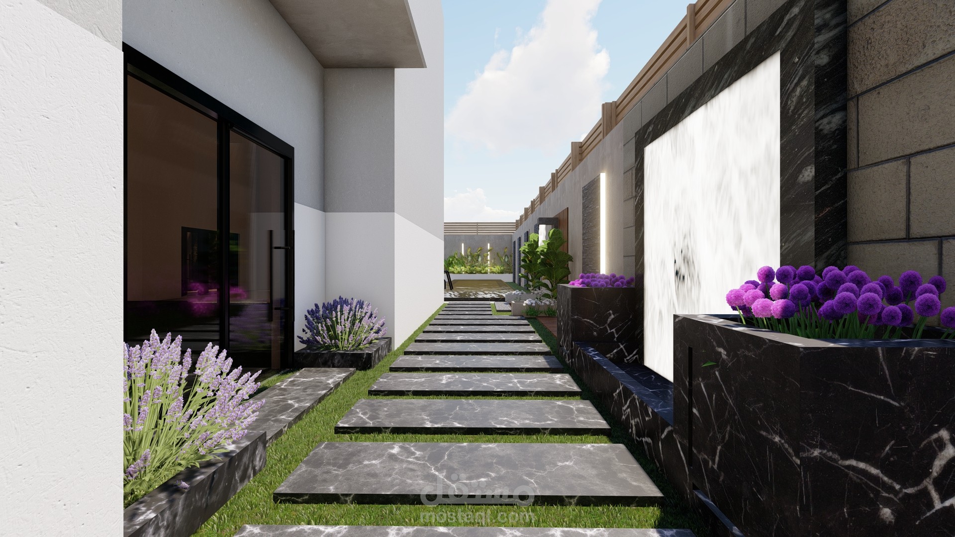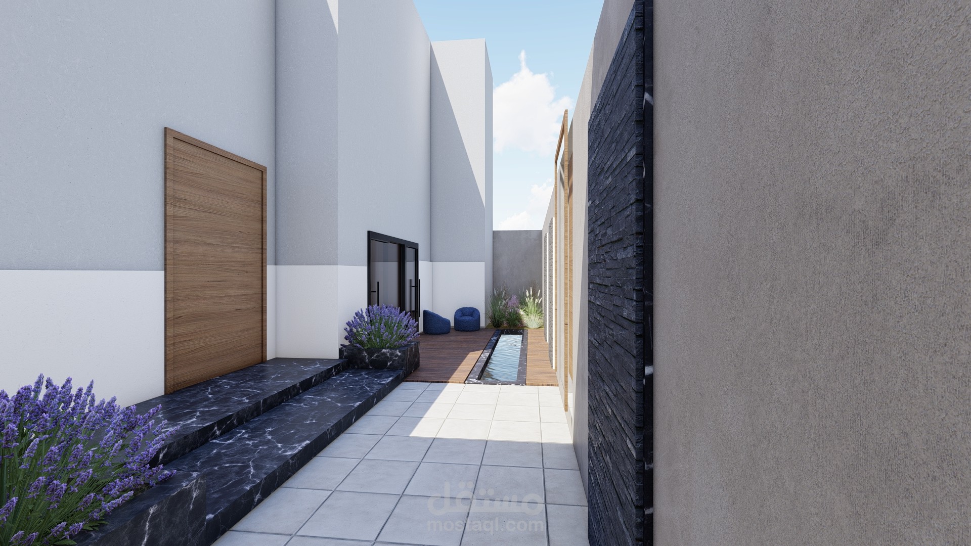 تصميم لاند سكيب لحديقة مزرعة في الامارات منطقة الباهية تحتوي على مسبح وركن استراحة و باربكيو و جلسات و ركن طعام و مساحات خضراء و مناطق لزراعة النباتات المفضلة