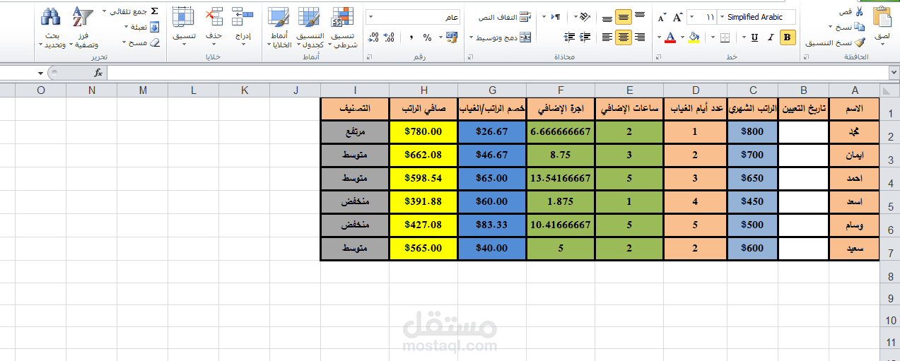 جدول من خلال استخدام برنامج اكسل و استخدام الدوال اللازمة لربط البيانات