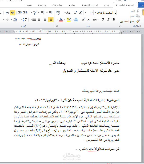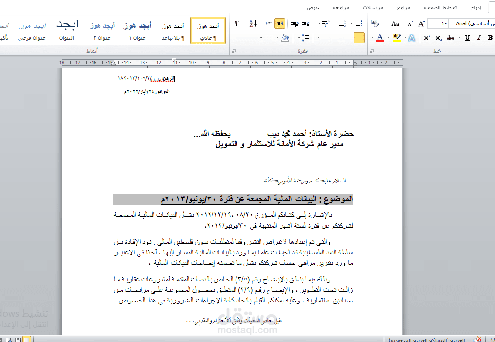 كتابة وتنسيق المراسلات من خلال استخدام برنامج الورد