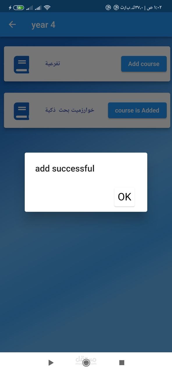 - courses page : حسث يتم عرض السنين الدراسية والمواد داخل كل فصل دراسي ويتمكن الطالب من اضافة مادة الى قائمه مواده
