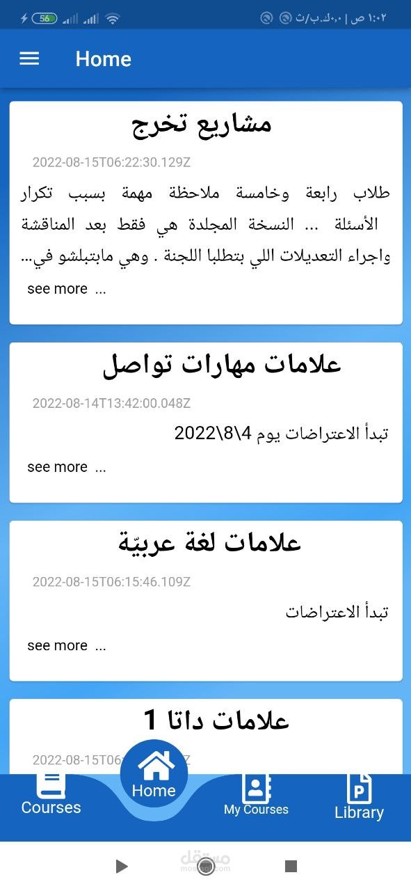 -Home page: التي تضمن الاعلانات التي يتم نشرها على المنصة التعليمية, حيث يتضمن الاعلان نص و ملف pdf.