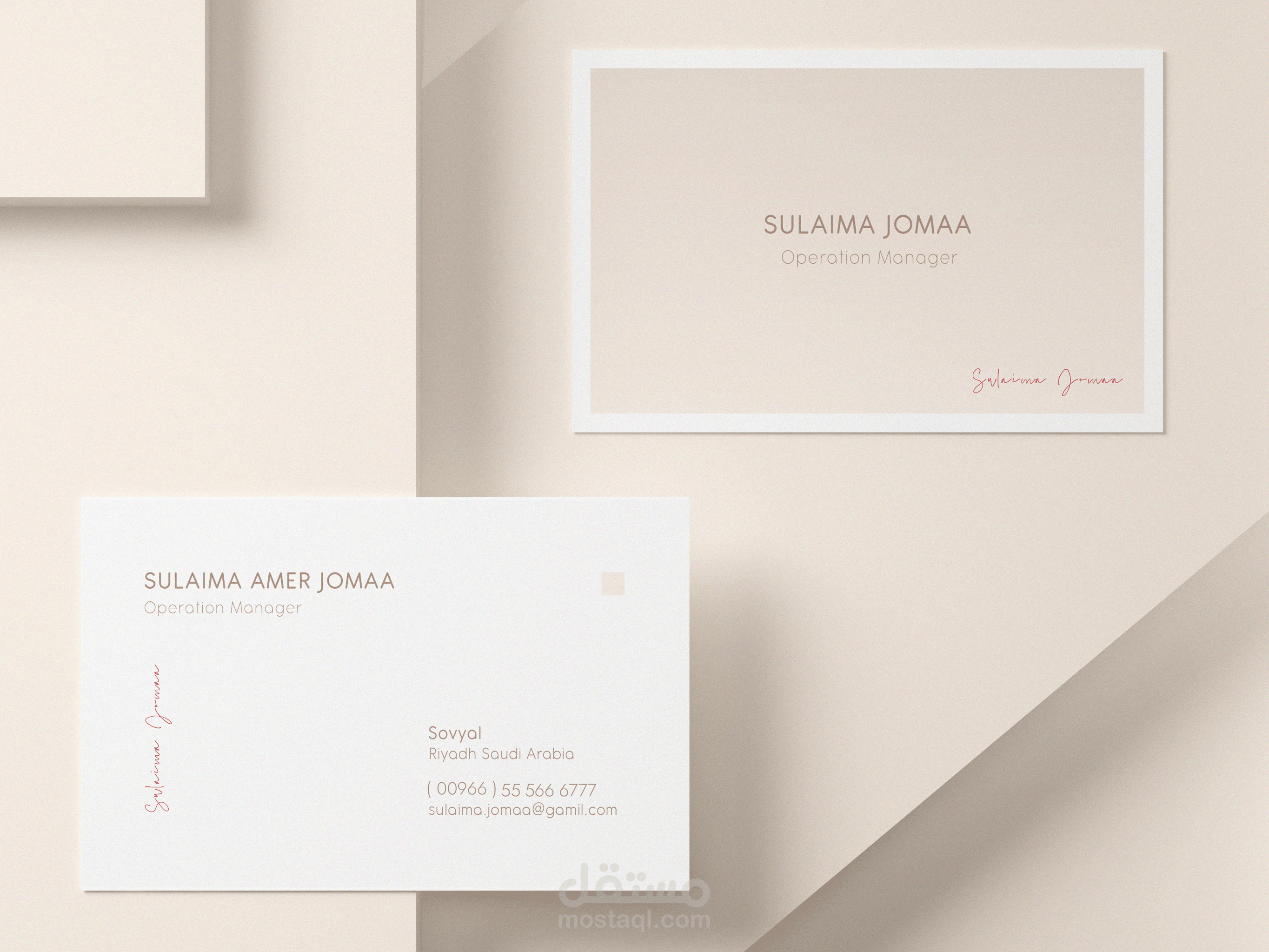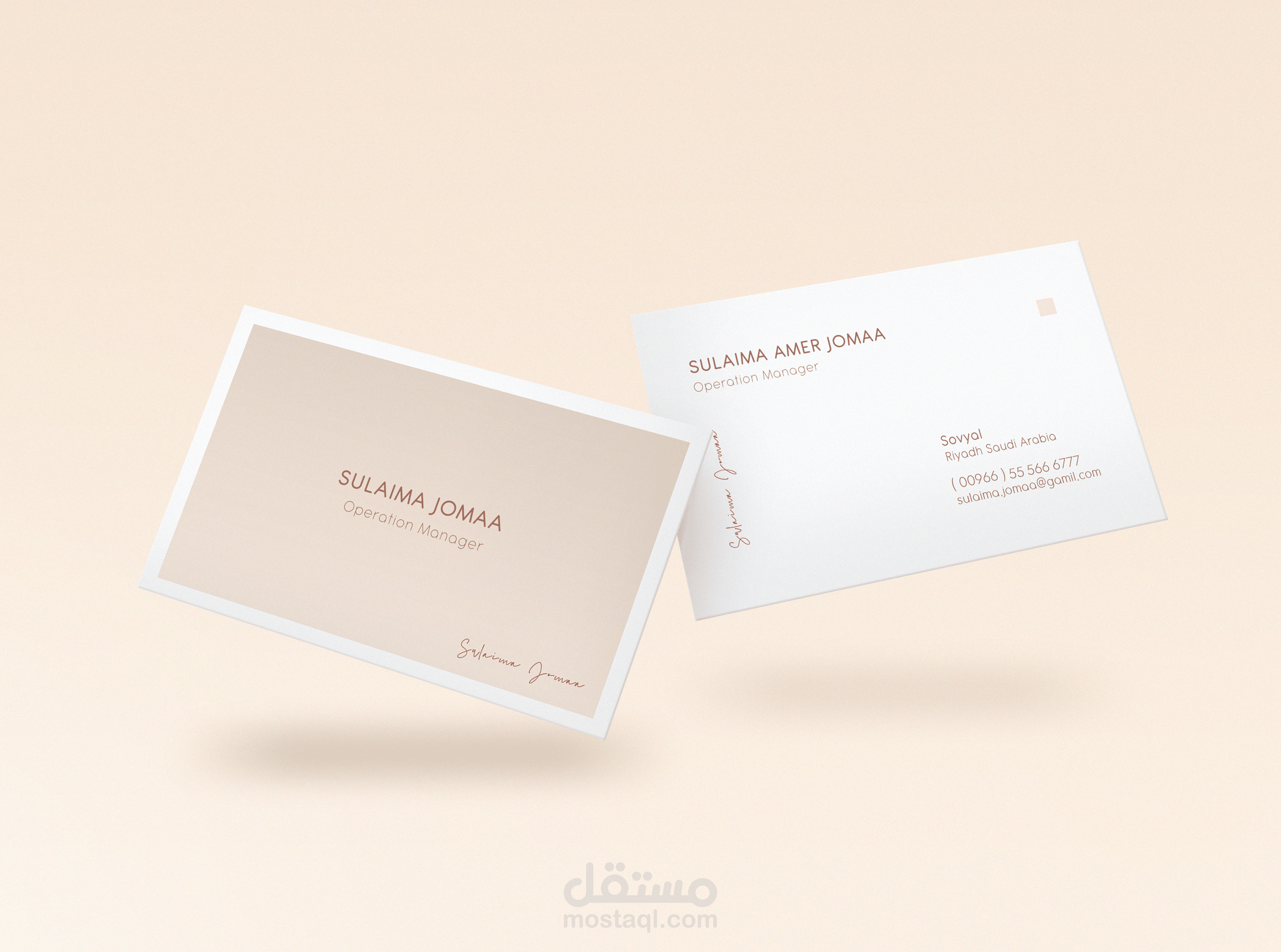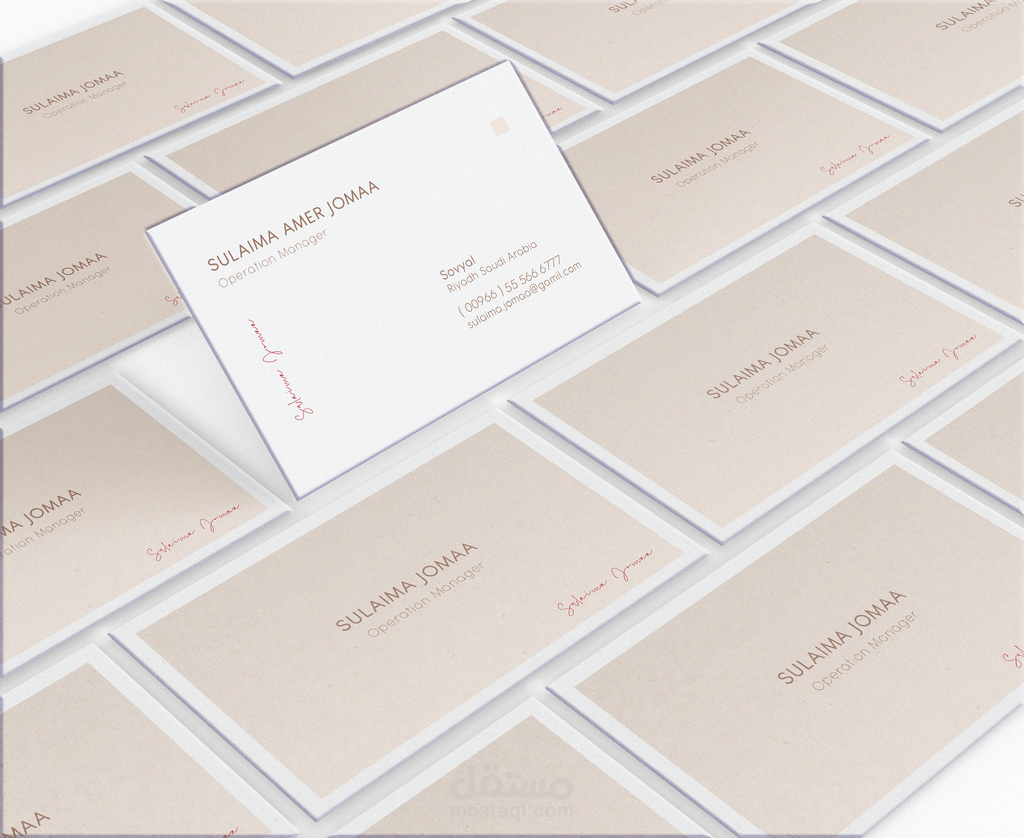 تصميم انيق وفاخر لبطاقة عمل بـ ألوان ناعمه ومريحة للعين تبعث الراحه لمن ينظر اليها, يكمن جمال وجاذبية البطاقة في بساطة التصميم حيث ان العناصر المستخدمة في التصميم مجرد خطوط راقيه منسقة بشكل جداب و مميز والوان هادئة تعبر عن شخصية صاحب البطاقة.