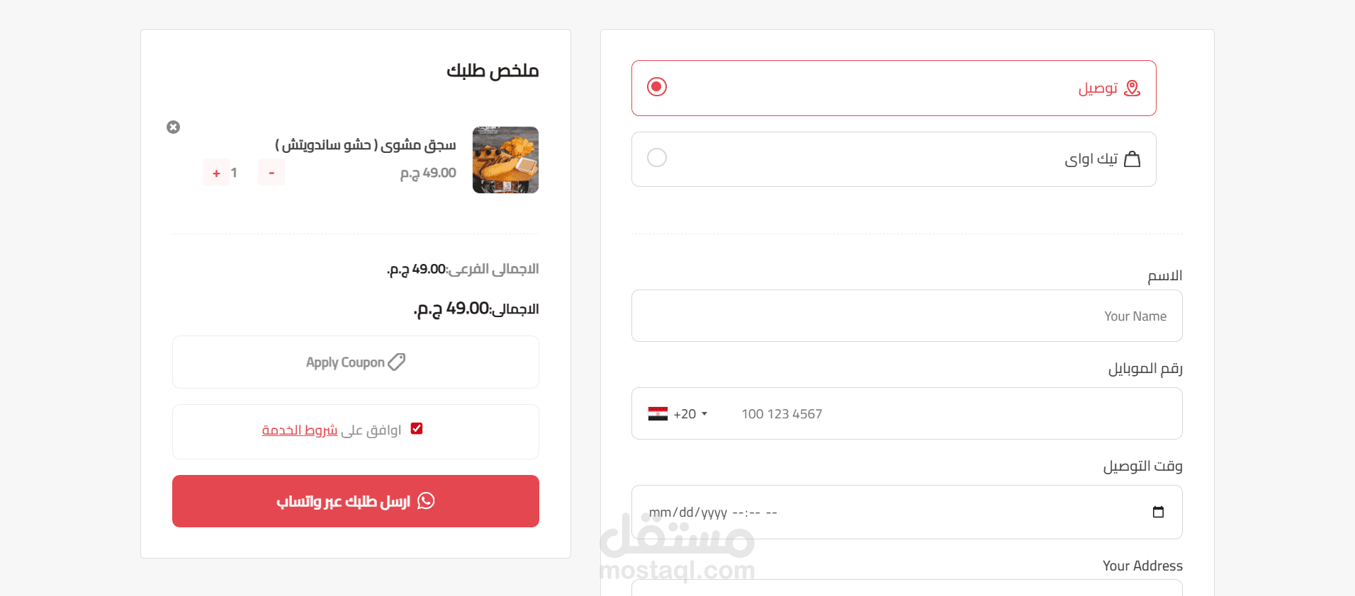 يدعم النظام خاصية إضافة المنتجات إلى سلة الطلبات الافتراضية، وعند اكتمال الاختيار يمكن للزبون إرسال الطلب مباشرة عبر تطبيق واتساب من خلال دمج واجهة إرسال الطلبات مع رقم المطعم المسجّل في النظام، مما يوفّر قناة تواصل مباشرة وسريعة دون الحاجة لعمليات دفع أو تسجيل دخول معقدة.