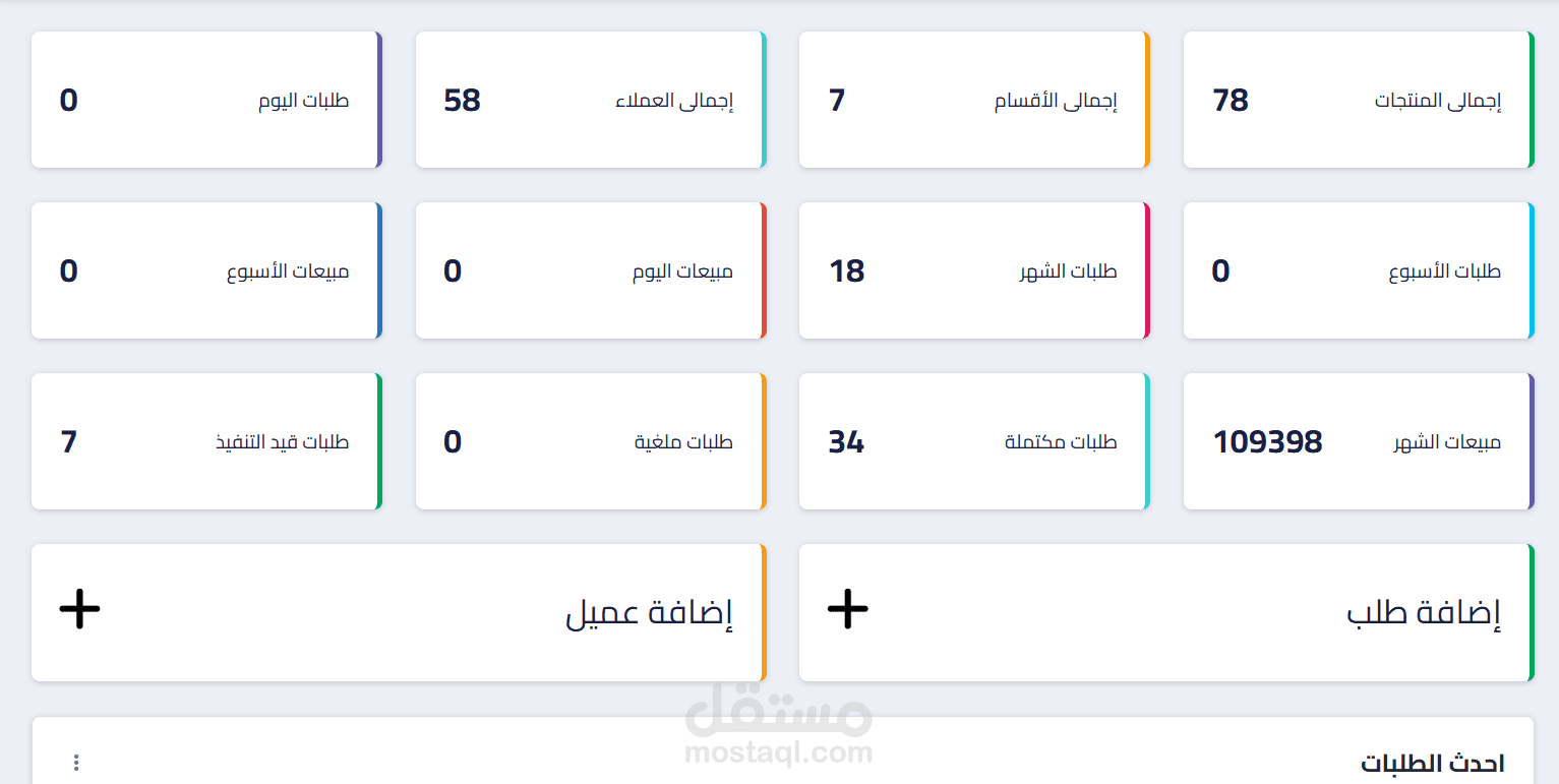 عرض إحصائيات وتقارير حول عدد الطلبات، أكثر المنتجات مبيعًا، ونشاط الزبائن.