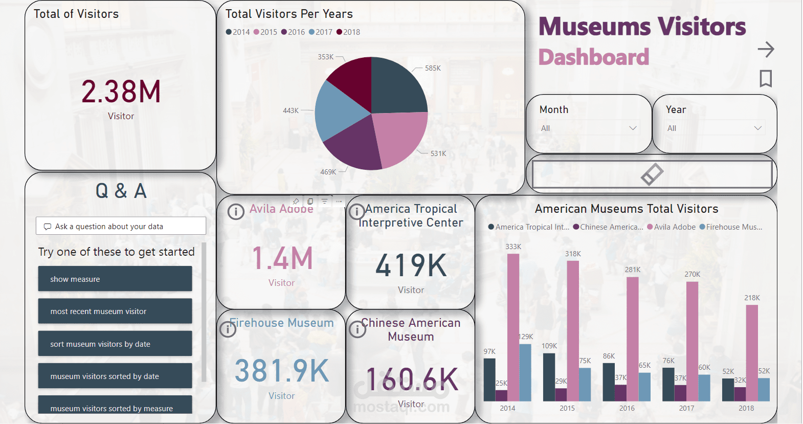 Dashboard for 4 museums visitors in America using PowerBI