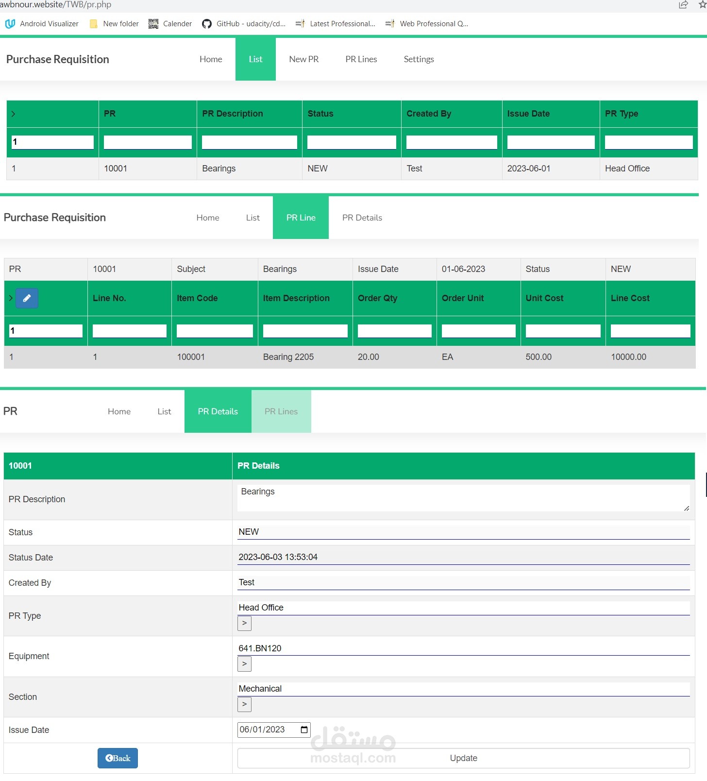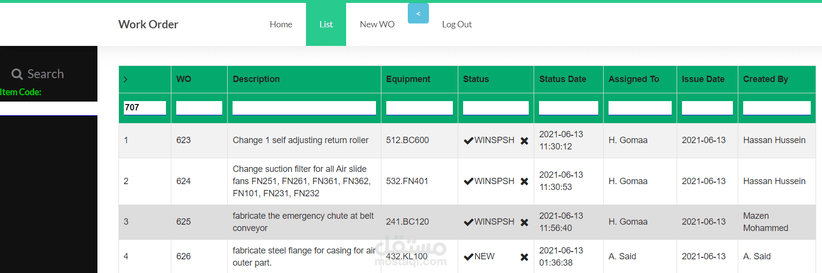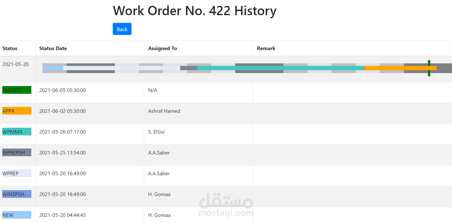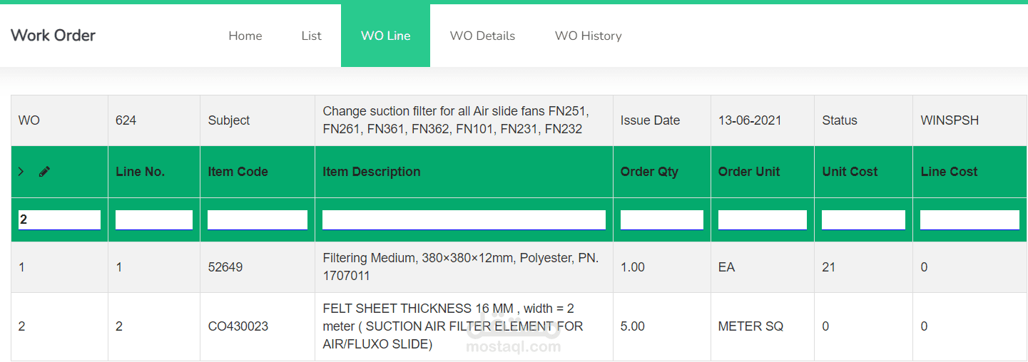تصميم كامل دورة العمل بعدد 16 مستخدم وعمل الصلاحيات المطلوبة لكل مجموعة مستخدمين بدءا من قيام المفتش في الموقع بإنشاء أمر الشغل على معدة معينة ثم موافقة رئيس قسم التفتيش ثم قيام قسم التخطيط باختيار قطع الغيار اللازمة لتنفيذ العمل وتحويل أمر الشغل إلى قسم الصيانة بعد موافقة مدير الصيانة الوقائية في حالة توفر قطعة الغيار بالمخزن انتهاءا بغلق أمر الشغل بعد انتهاء مهندس الصيانة من تنفيذه