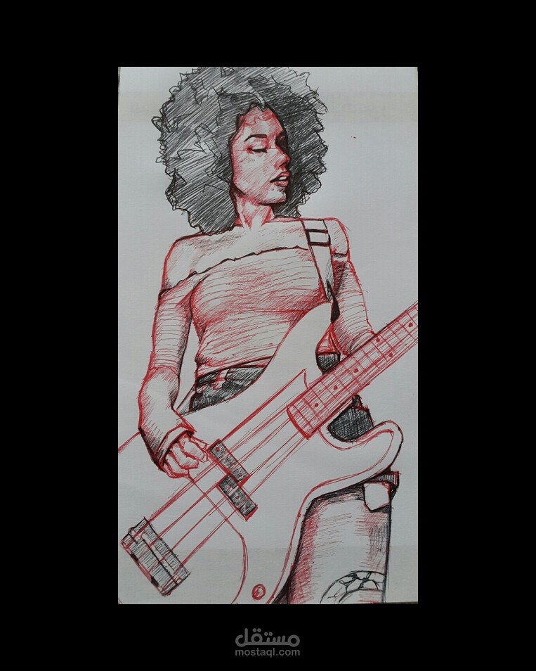 A full body drawing was done using two types of pen colors, the main one is red that used to build the basic shape and the support one is black was used to help showing more details