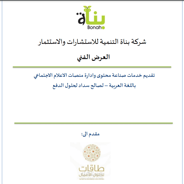 تم اعداد هذا العرض الفني لصالح شركة بناة للتنمية حيث أن هذا العرض مقدم للمنافسة على مناقصات مختصة في مجال تقديم خدمات صناعة المحتوى وادارة منصات التواصل الاجتماعي