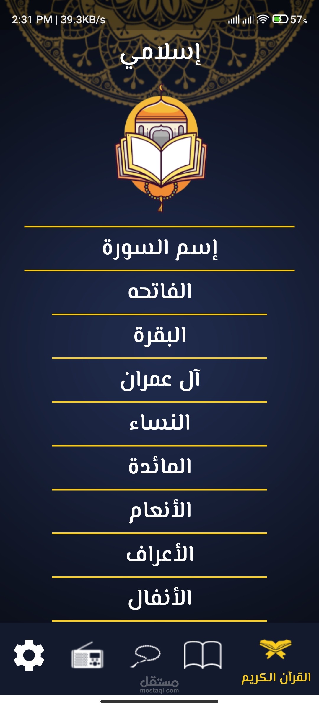 الأولي: وهي لعرض سور القران الكريم وعند الضغط علي السورة ياخذك الي صفحة اخر لتتمكن من قراءة السورة بالكامل.