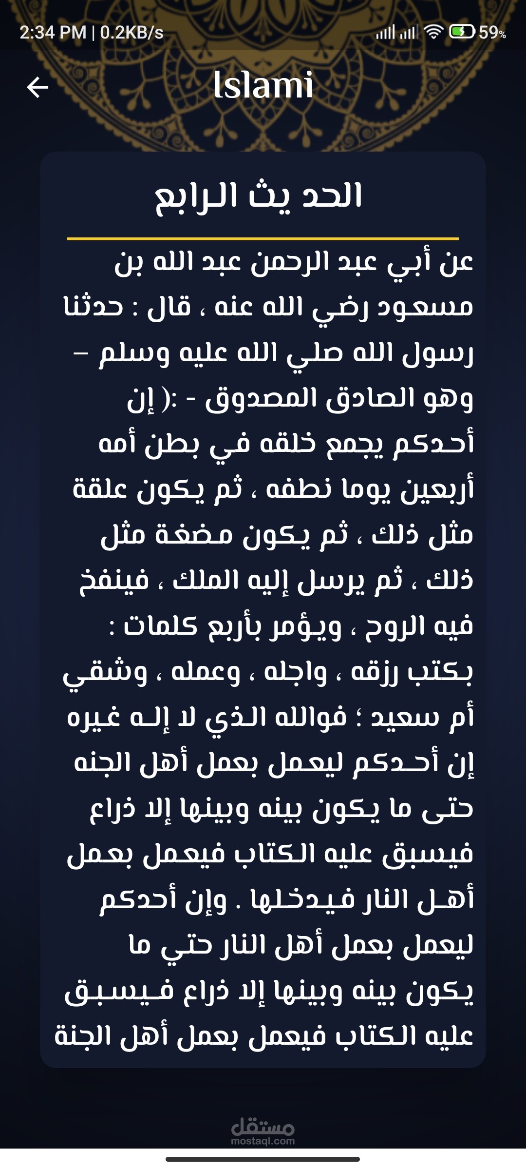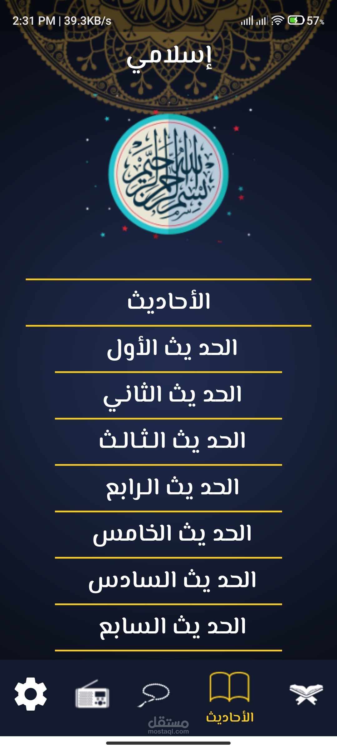الثانية: وهي لعرض بعض من الاحاديث النبوية ومثلها مثل سور القران عند الضغط علي الحديث ياخذك لصفحة اخري لتتمكن من قراءة الحديث بالكامل.