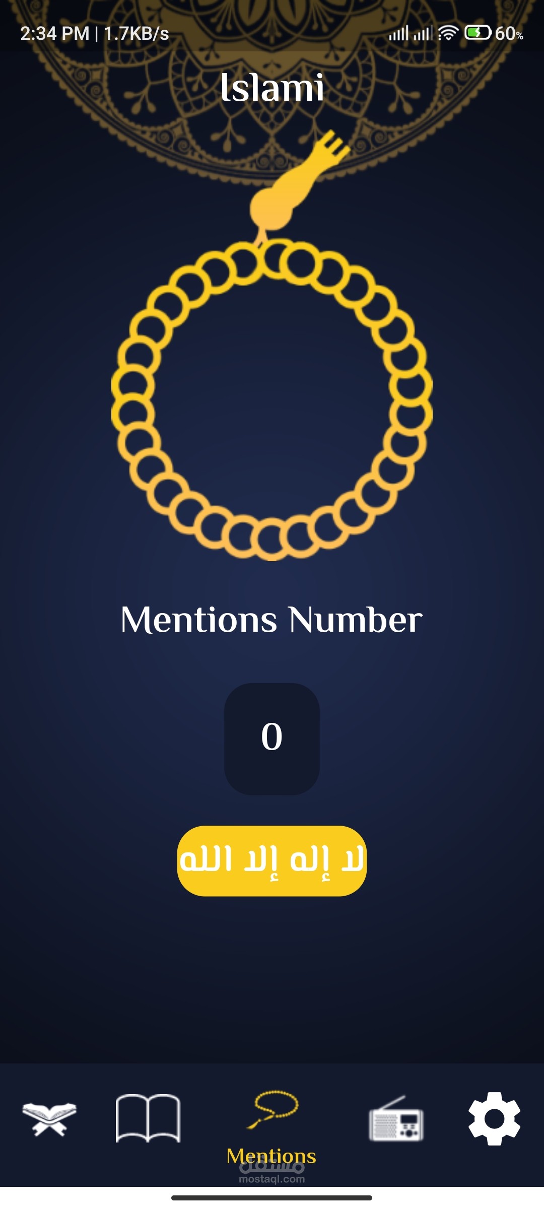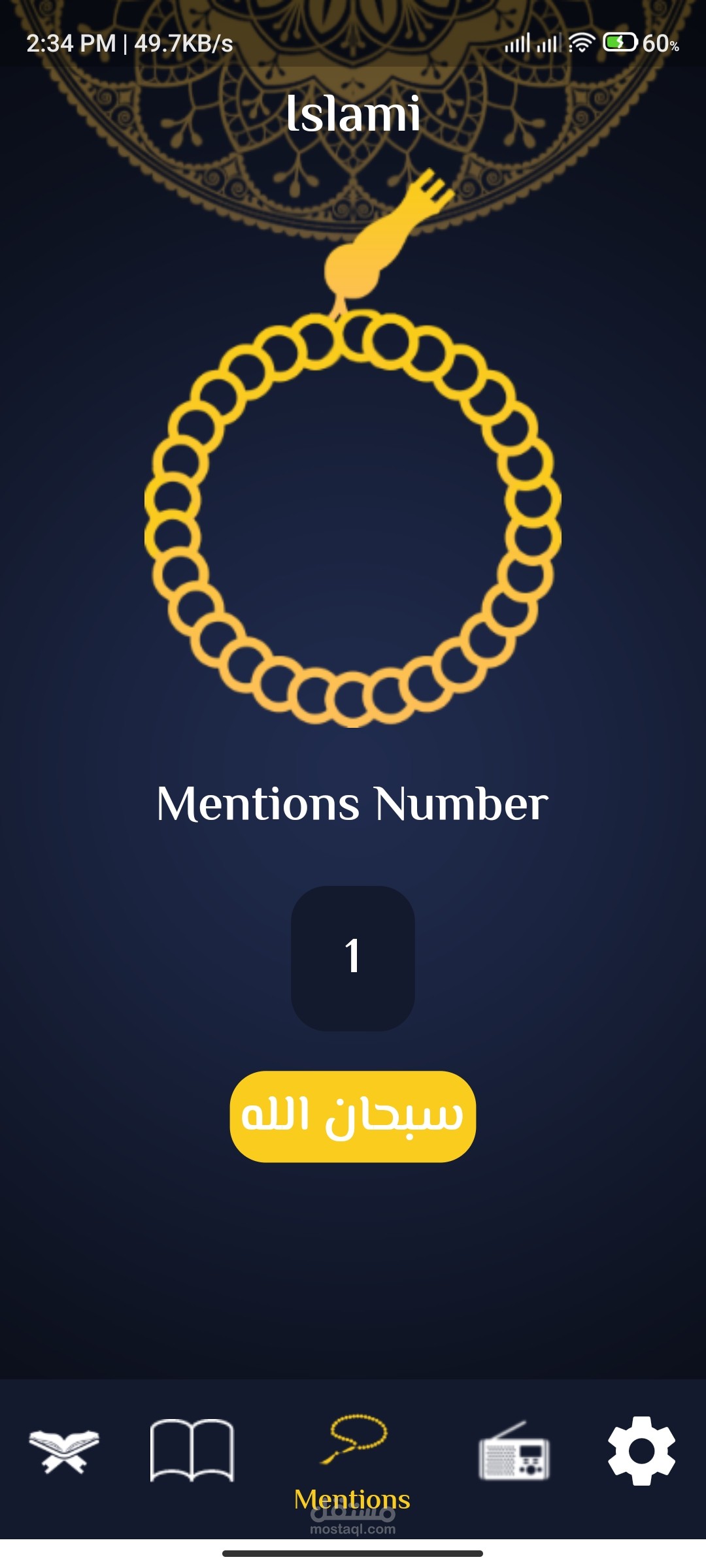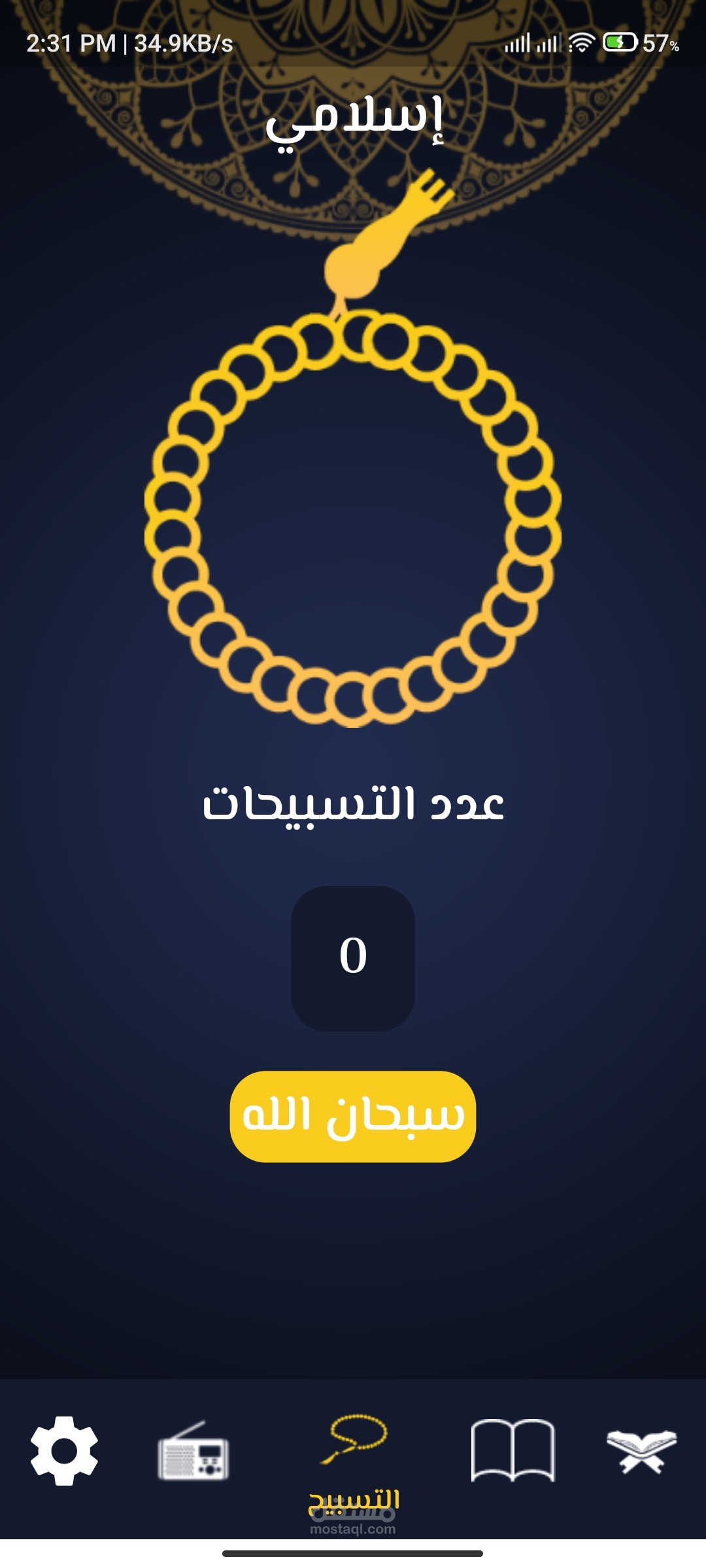 الثالثة: وهي للسبحة وهي تعمل بالضغط علي صورة السبحة فيبدأ العد فالتسبيح وتتغير التسبيحات كل 33 عدة(سبحان الله - الحمدلله - الله اكبر- لا اله الا الله).