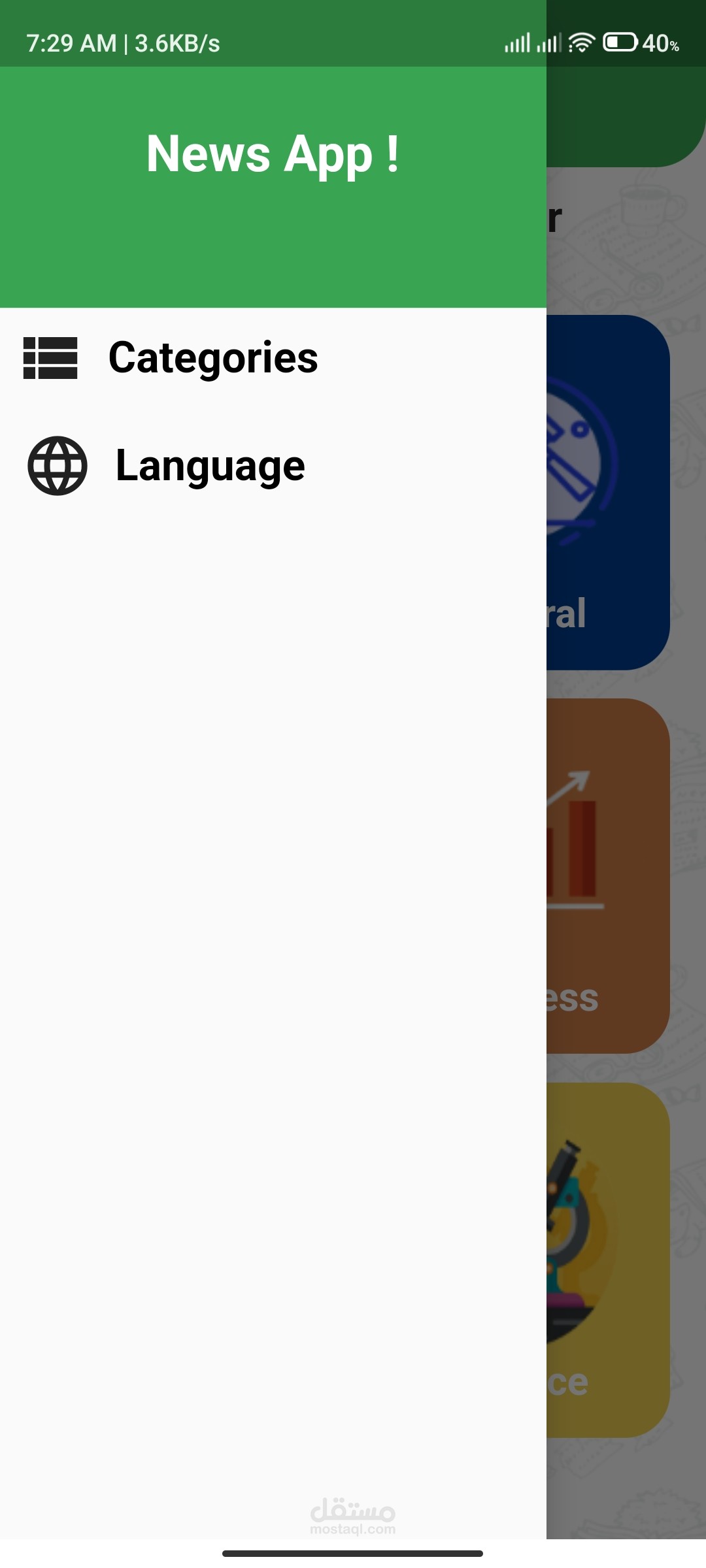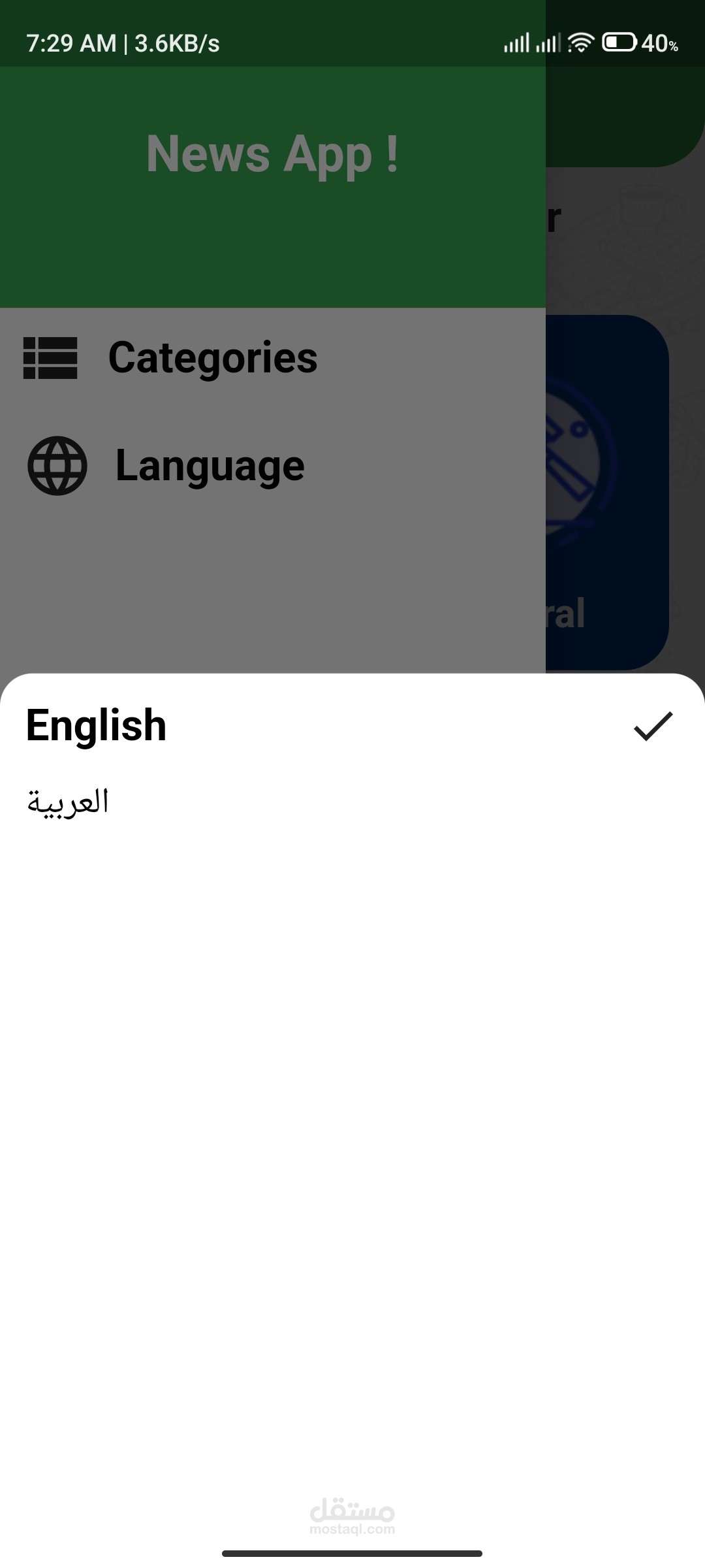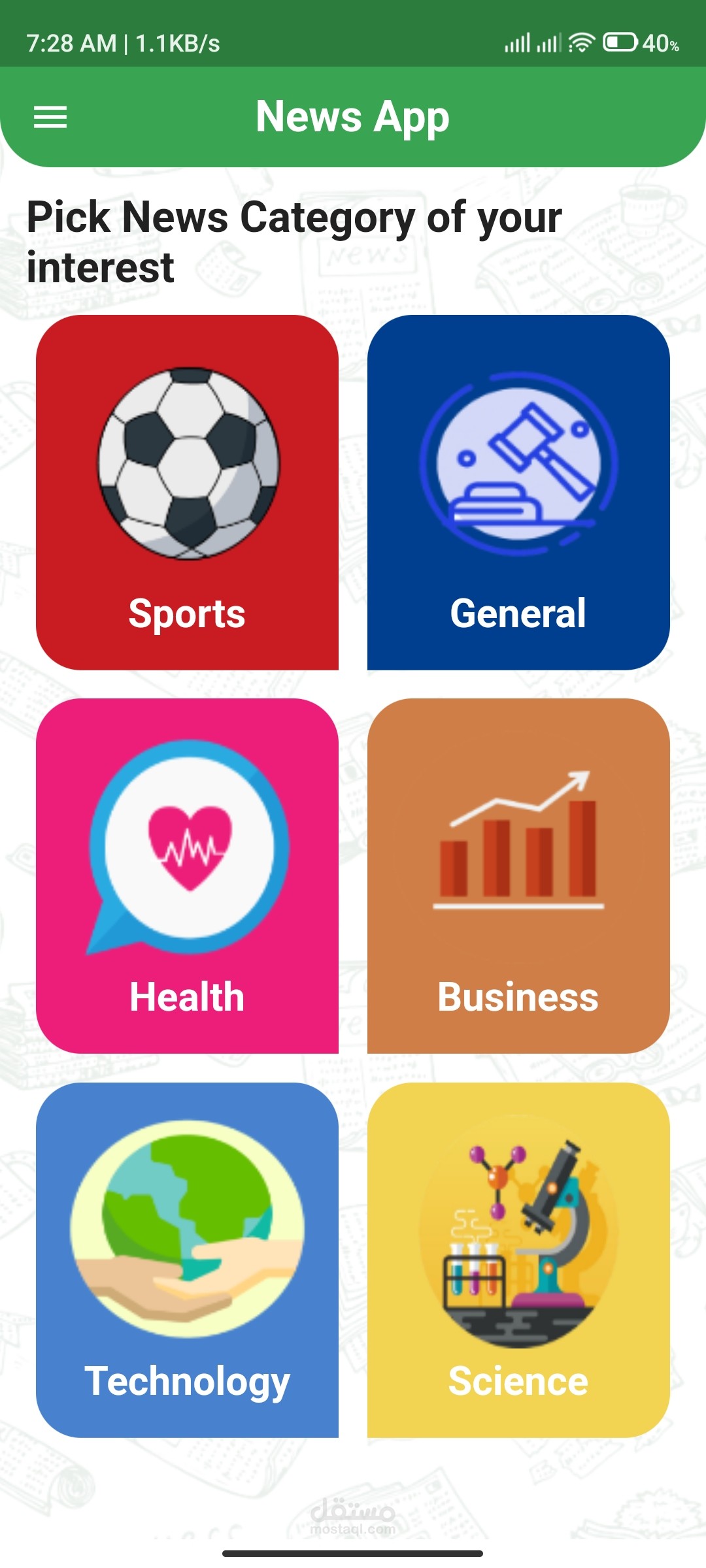 تطبيق الاخبار العالمية به 6 مجالات مختلفة للاخبار مثلا الرياضة والتكنولوجيا والترفيه...وغيرها
