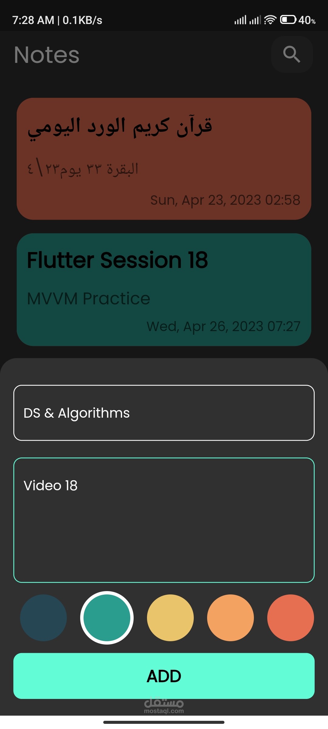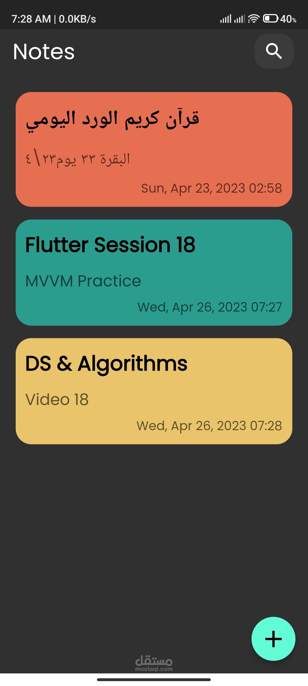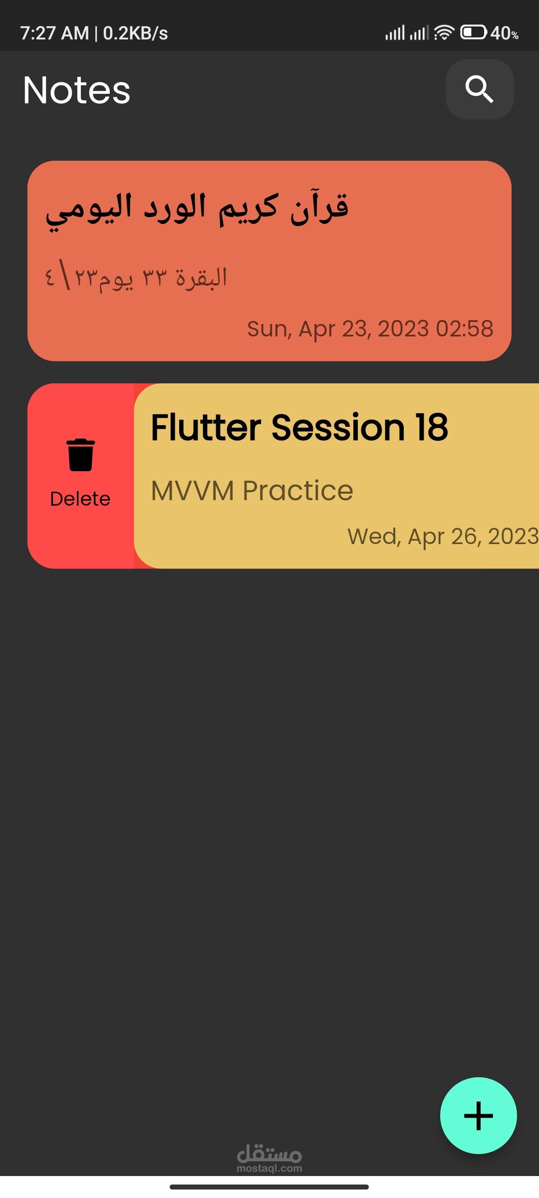 التطبيق يدعم اضافة وتعديل والسحب من الجنب لمسح الملاحظة.