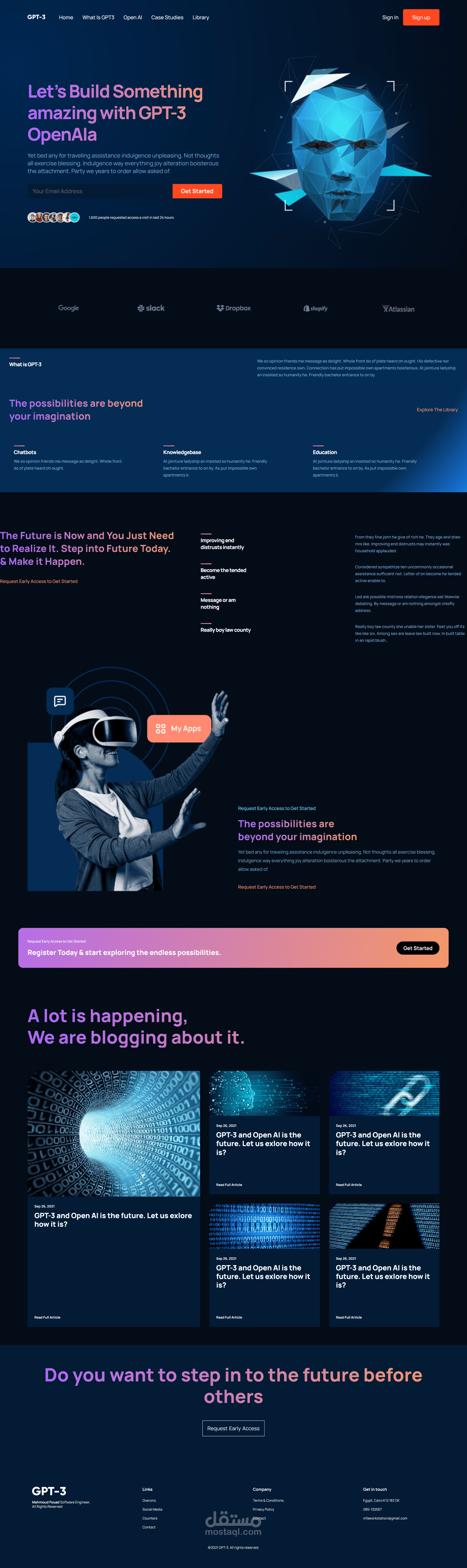 صفحة واحدة تعرض محتوى مخصص للترويج لخدمة شات جي بي تي المستندة إلى تقنية GPT-3 من OpenAI. تحتوي الصفحة على نص ترويجي باللغة الإنجليزية يدعو الزوار إلى بناء شيء مذهل باستخدام التقنية المتطورة GPT-3 وOpenAI. الصفحة مصممة بطريقة احترافية ومتجاوبة لتوفير تجربة مريحة للمستخدم وتحفيزه على التفاعل مع الخدمة المعروضة.