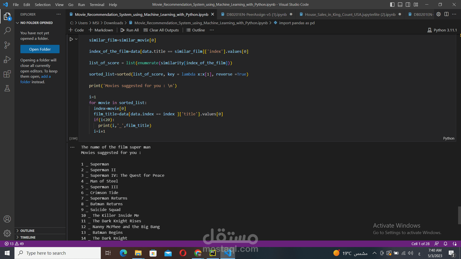 قمت بعمل عده مشاريع بالذكاء الاصطناعى منها عمل توصيه لمشاهده الافلام على مواقع للافلام عن طريق معرفه اسم الفيلم المفضل وذلك موضح فى الصوره المرفقه كما ان هناك مشاريع اخرى من توقع اسعار الذهب وتوقع سعر المنزل والتنبؤ بالامراض ومعرفه ما اذا كان الشخضص مصاب او سليم كل ذلك باستخدام الذكاء الاصطناعى
