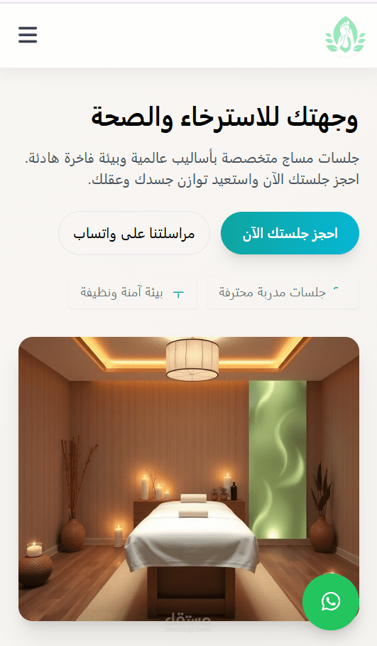 صفحة لاندنج متكاملة، منظمة وجذابة، تعكس هوية مركز المساج وتوفر طريقة تواصل سريعة واحترافية عبر الواتساب.