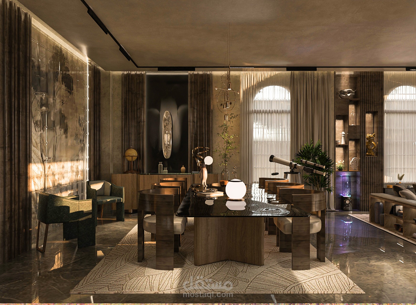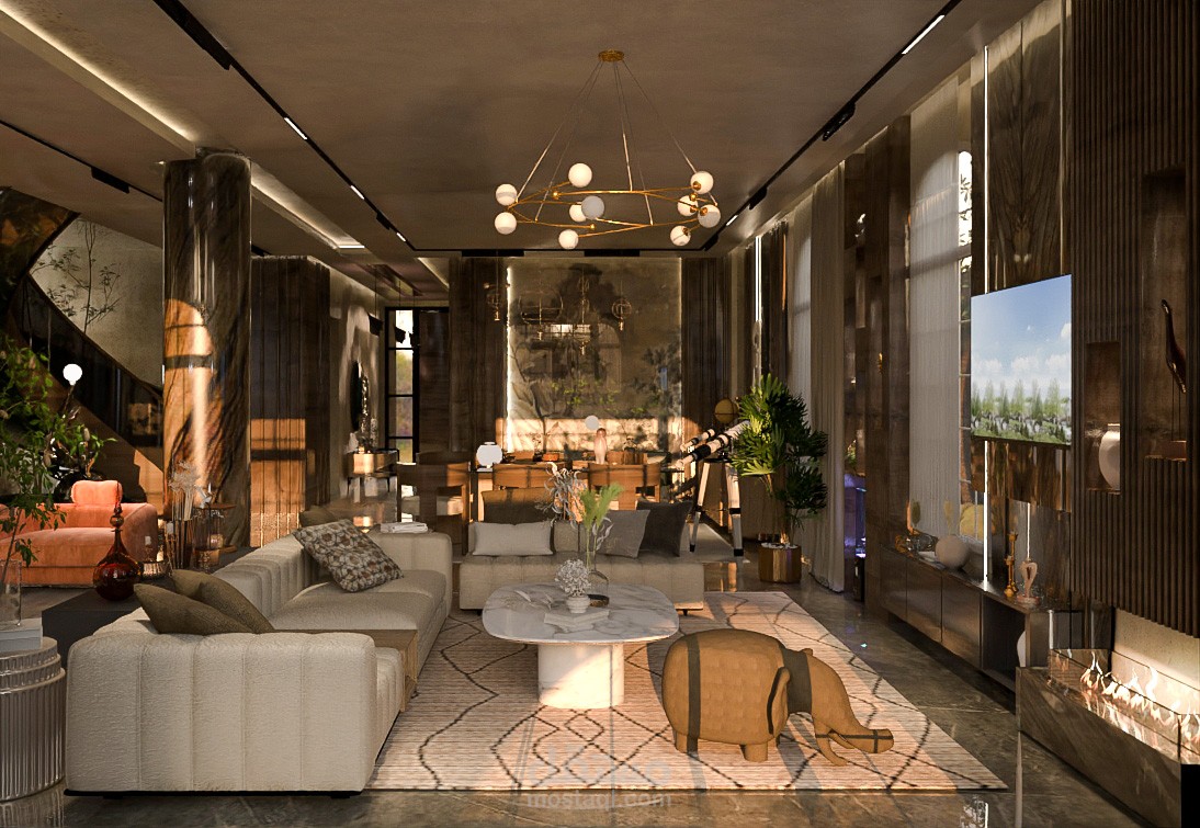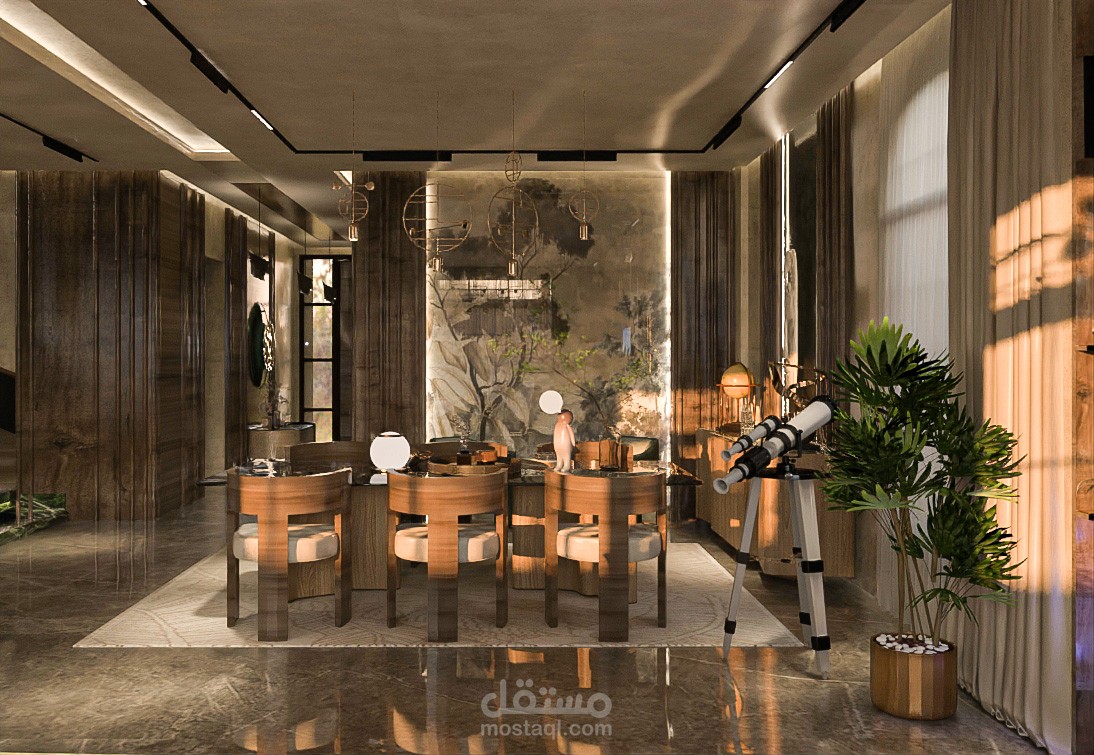 تصميم للاستقبال على التصميم الafrican حيث استخدام الطبيعة من الخشب و الالوان الهادئة لتناسب الاستخدام للغرفة