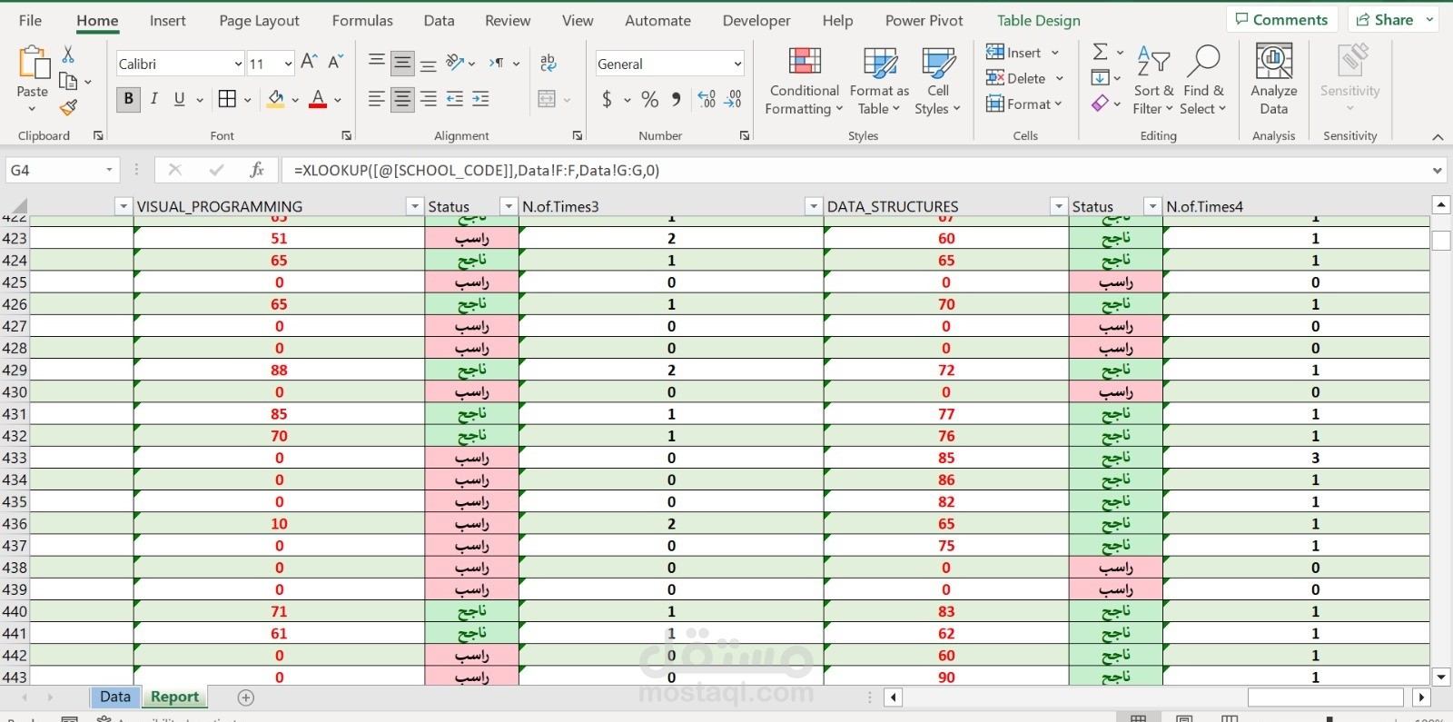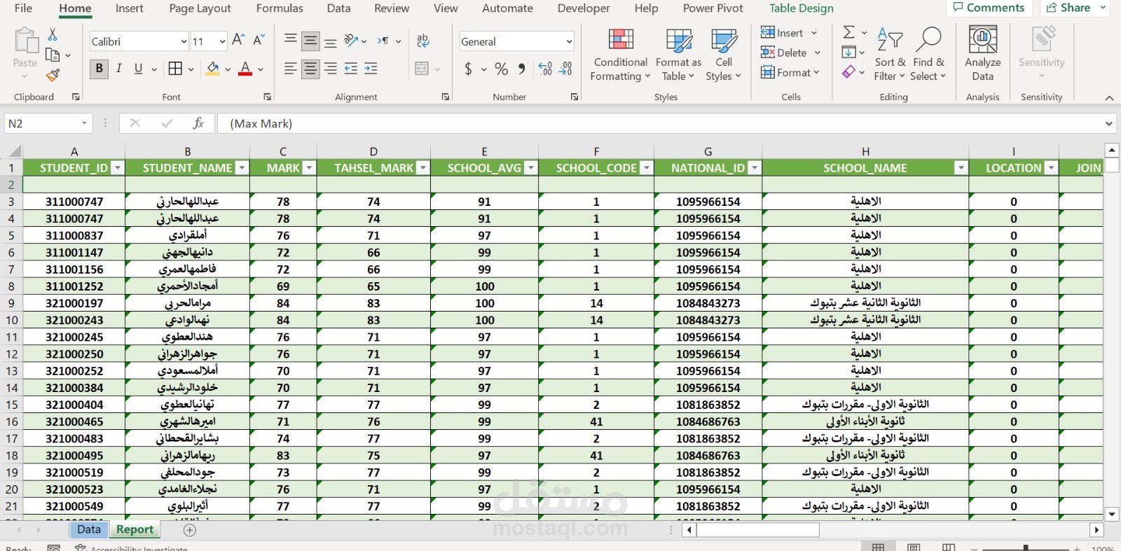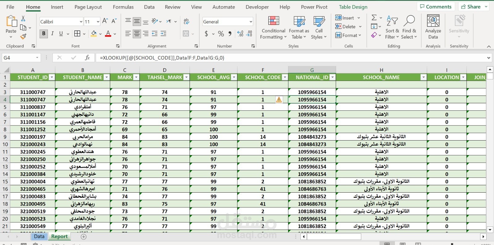 * سحب جميع البيانات من الداتا التي تخص رقم الطالب واسمه ورقمه والمدرسة والصف الخاص به من خلال معادلات حسابية .