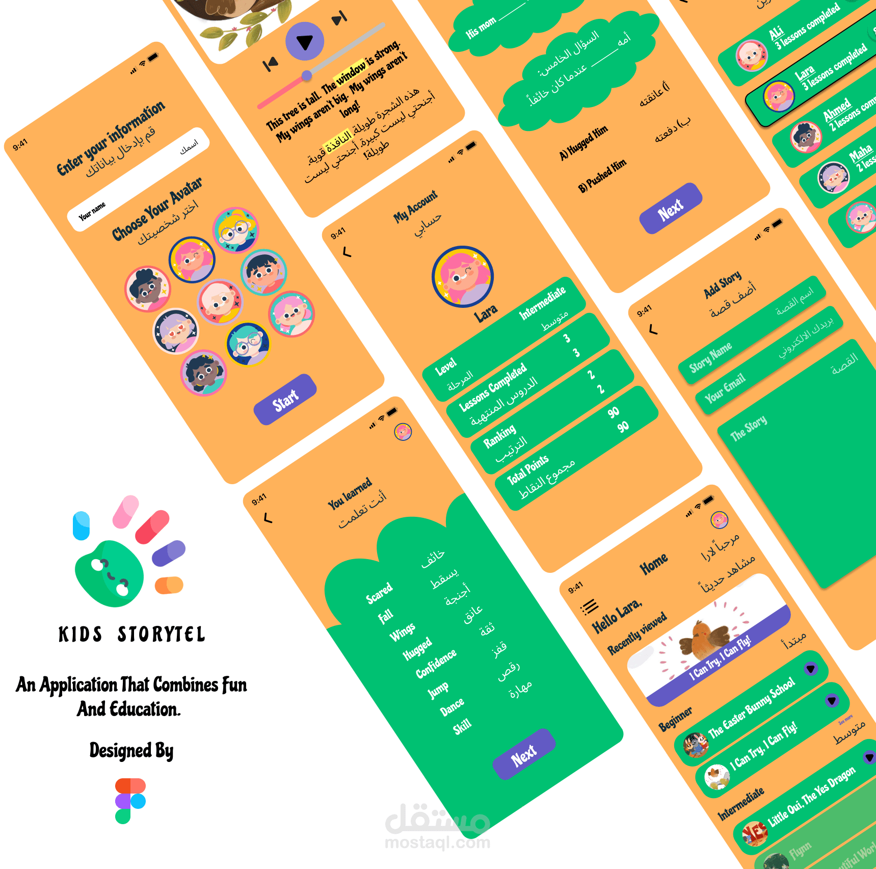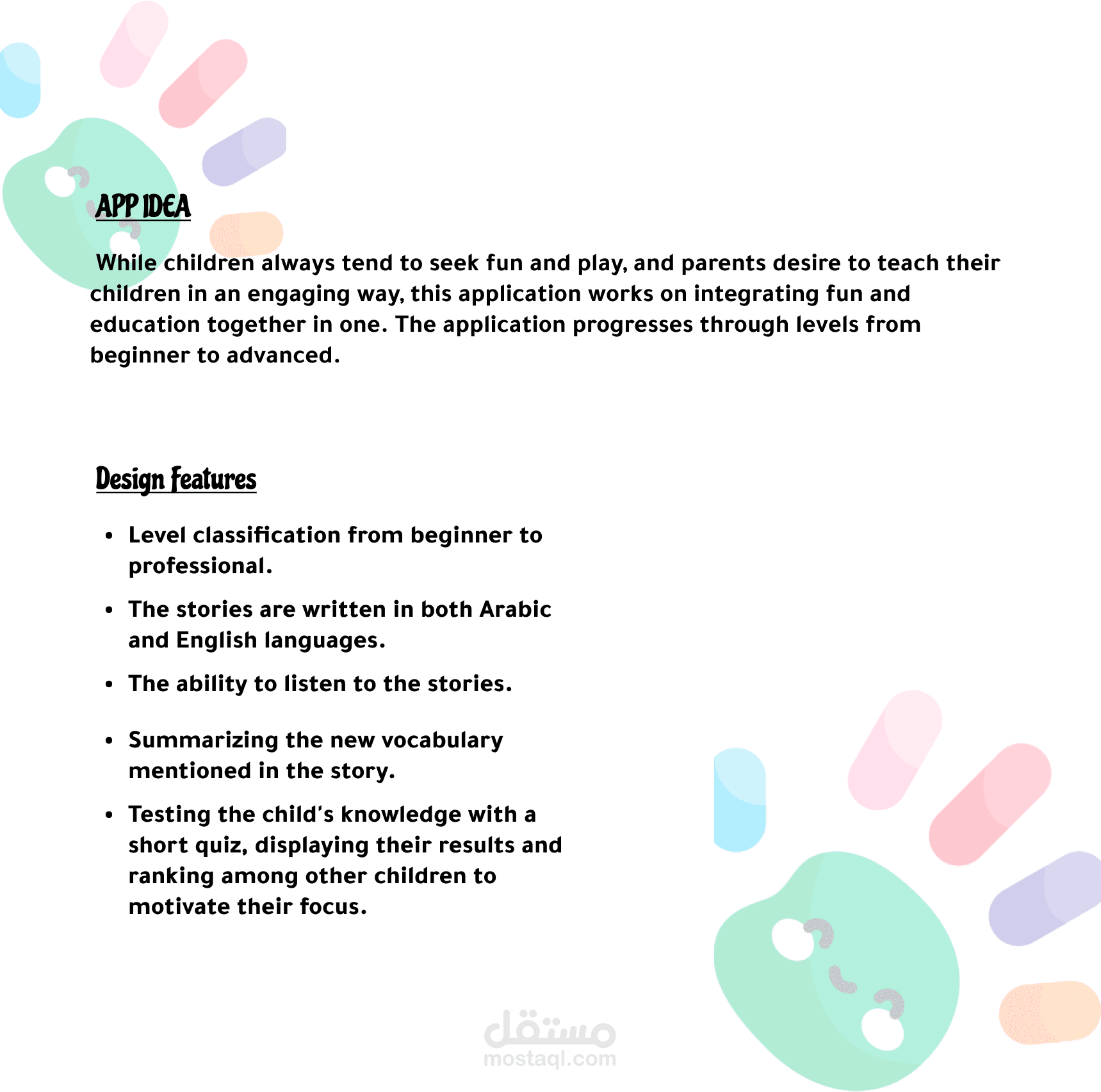 تطبيق مخصص للأطفال يدمج بين التعليم والمتعة، حيث يتمكن الطفل من خلاله تعلم اللغة الانجليزية والاستمتاع بقراءة القصص المسلية باللغتين العربية والانجليزية.