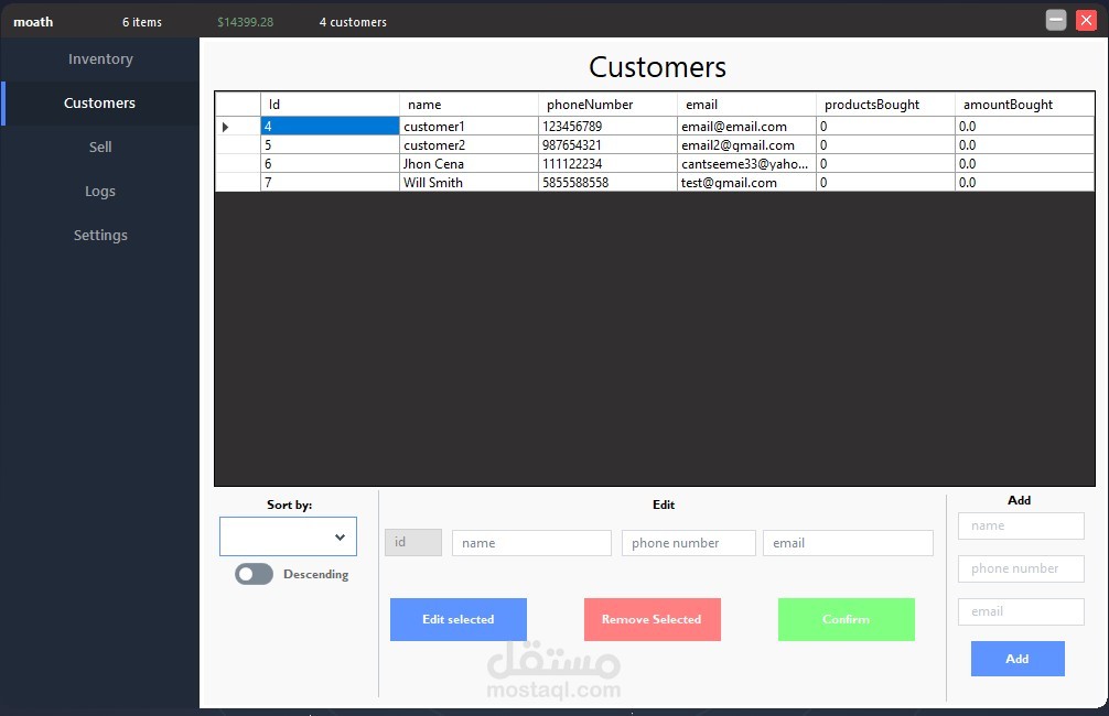 The application also has a tab to manage customers. This tab allows the user to view a list of all customers and their contact information. The user can add new customers or update existing ones through this tab.