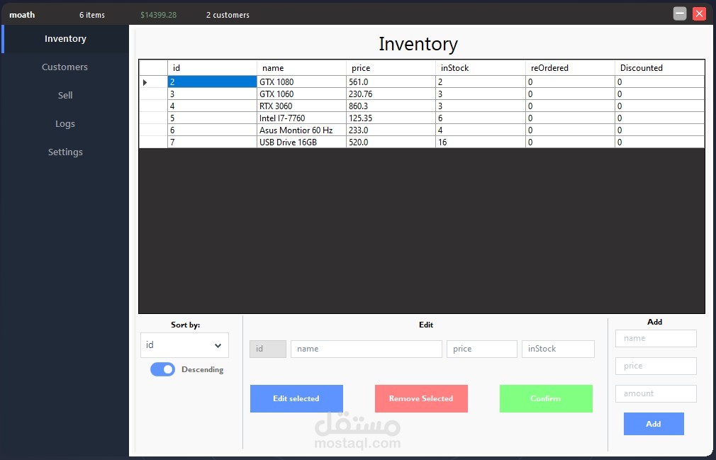 The most important tab of the application is the "Sell" tab, which allows the user to sell a product to a customer. To use this tab, the user must first log in with an admin account, which is stored in the database. Once logged in, the user can select a customer from the list and a product from the list of available products. The application will then prompt the user to enter the quantity of the product to be sold. The application will automatically update the product quantity in the database and generate a receipt for the transaction.