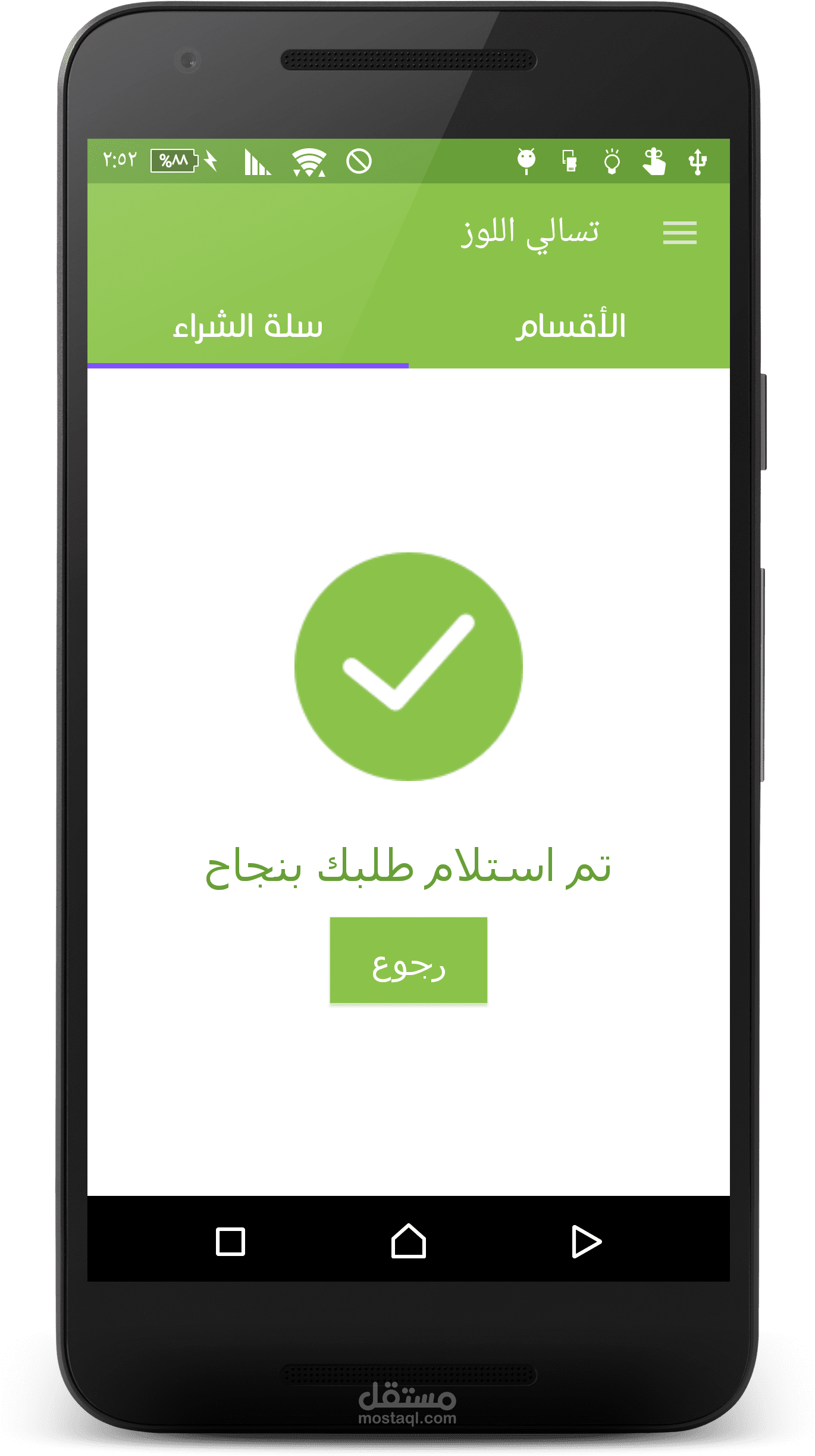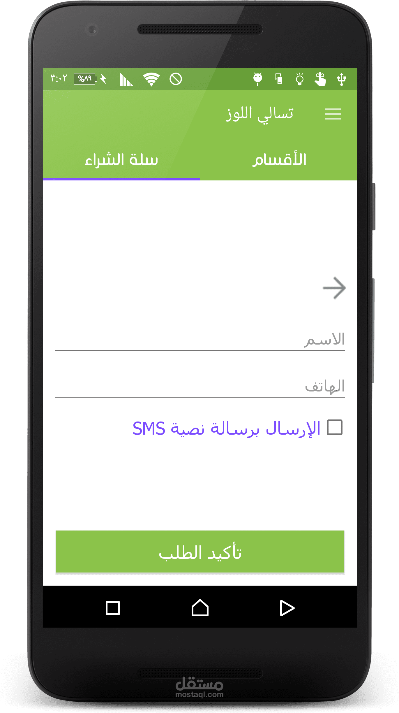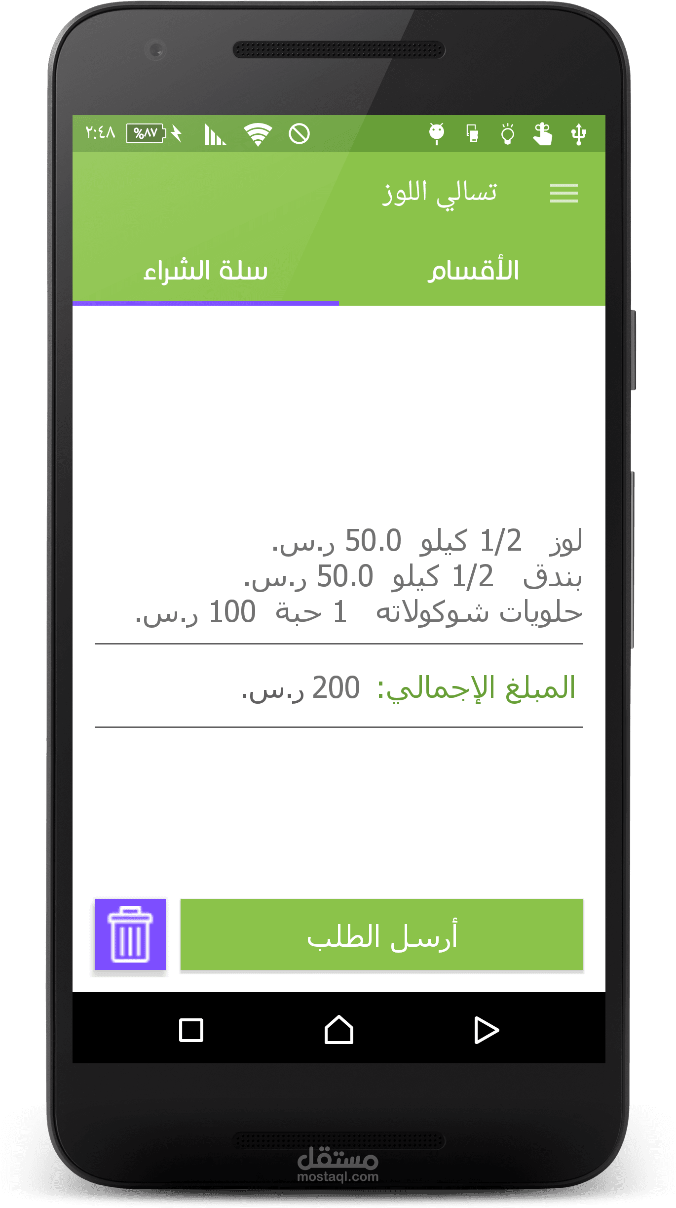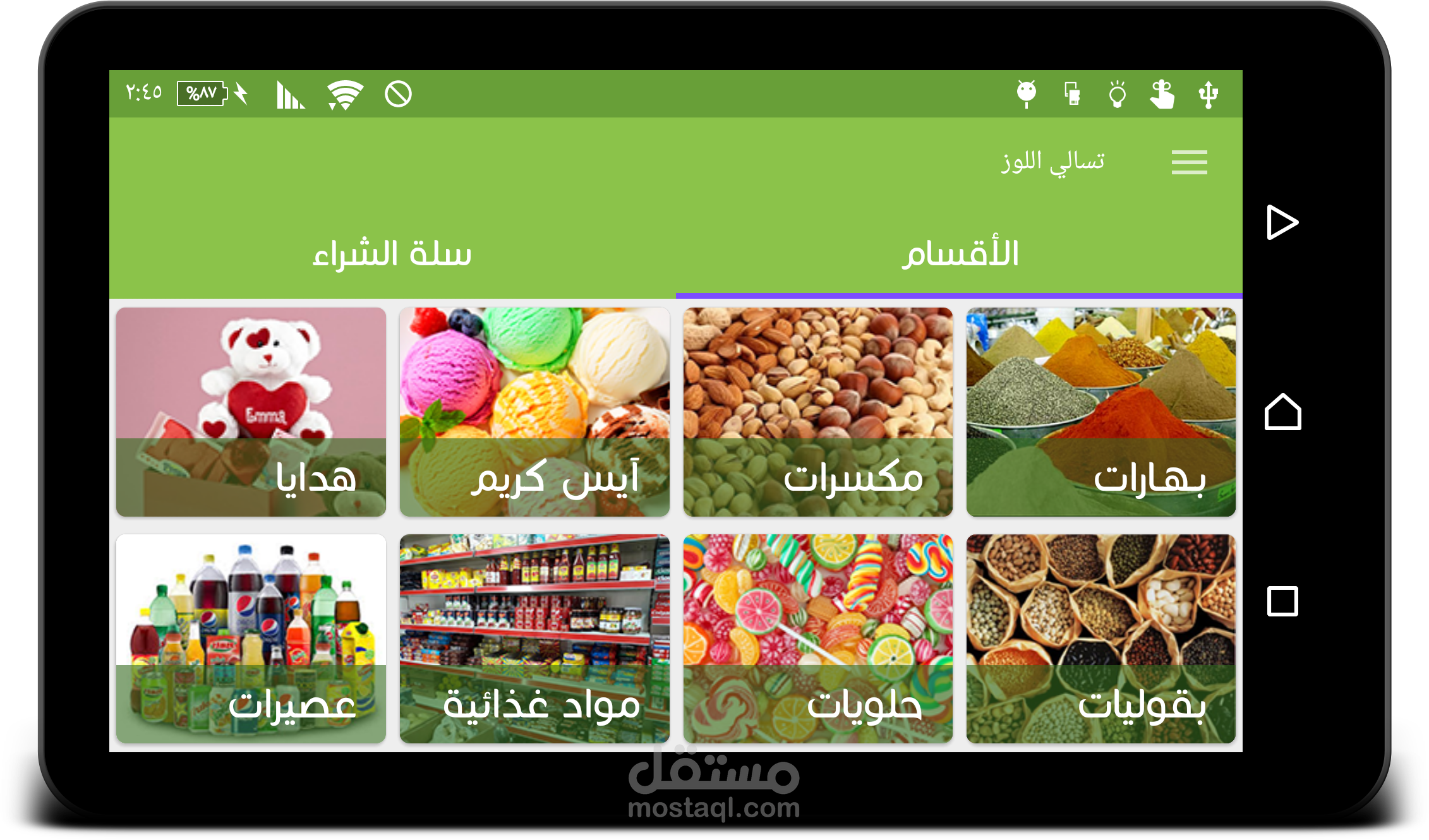 تطبيق لطلب الأطعمة من محل تسالي اللوز ، يتم إضافة الطلبات الى سلة الشراء ثم ترسل بالإيميل أو برسالة قصيرة ليتم تجهيزها.