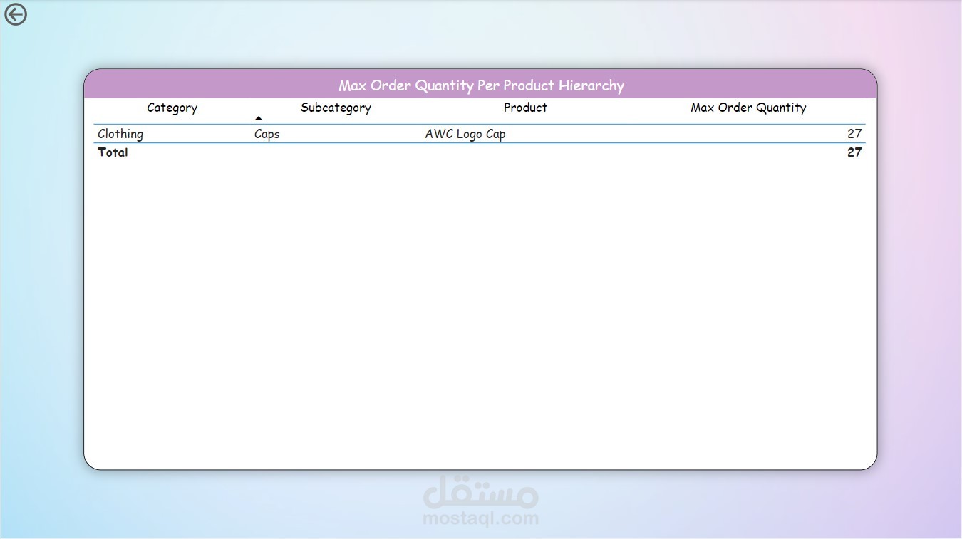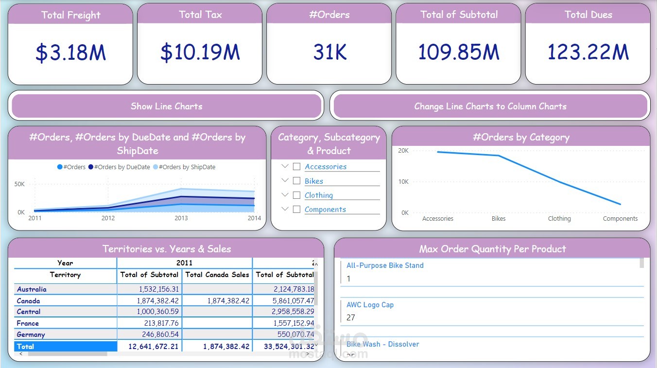 - Since the products have a lot of details, I also created a drill through page so that whenever the business owner wants to check every product's name, category, subcategory and max quantity ordered to identify the bestselling products, he'll easily can do this.