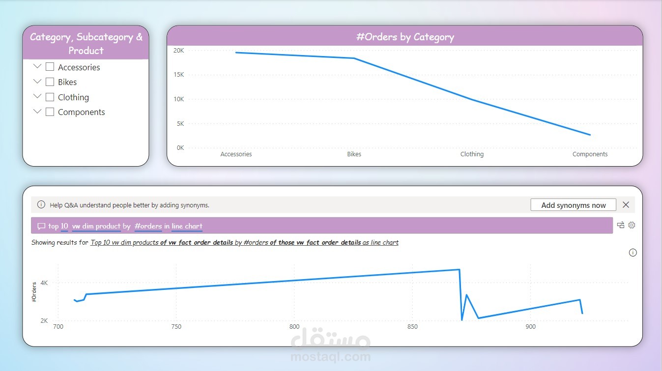 - Finally, I also created a Q&A chart and put multiple synonyms so it would be easy for the owner to ask about anything he wants, and I edited the interactions of the slicer so that it won't affect the answers he's expecting to the required question.