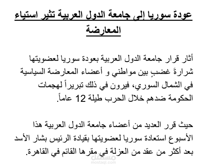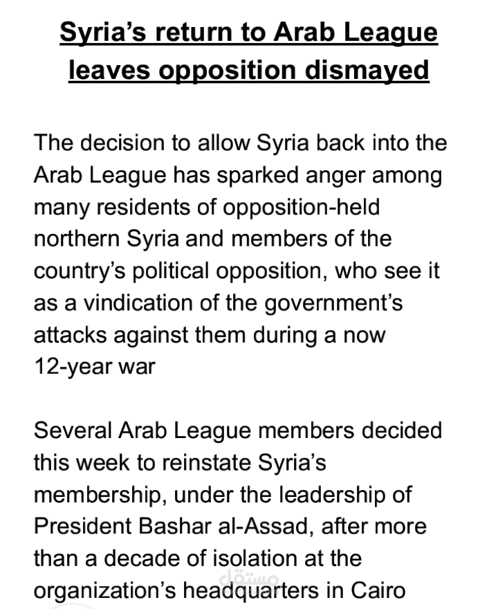 ترجمتي من الانجليزية إلى العربية ل مقتطف من الأخبار حول عودة سوريا لجامعة الدول العربية.