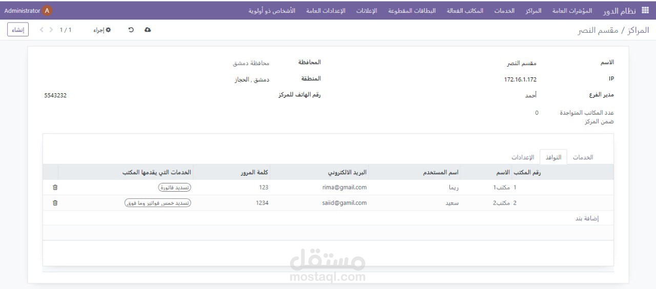 •يتم فيها تحديد اسم الفرع , المحافظة , IP , مدير الفرع , الخدمات التي يقدمها , المكاتب المتواجدة ضمن هذا الفرع , الموظفين المتواجدين ضمن هذا الفرع , الموظفين التابعين لهذا الفرع ( اسم المستخدم , كلمة المرور , البريد الالكتروني )