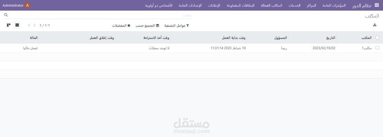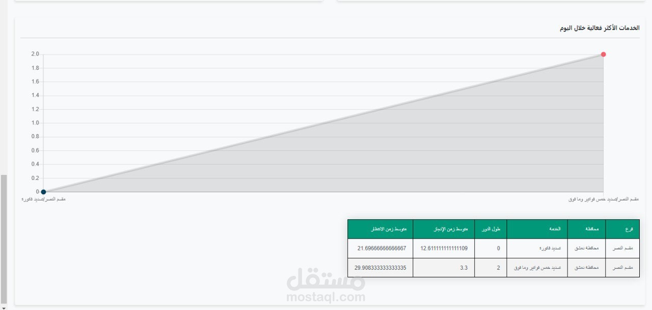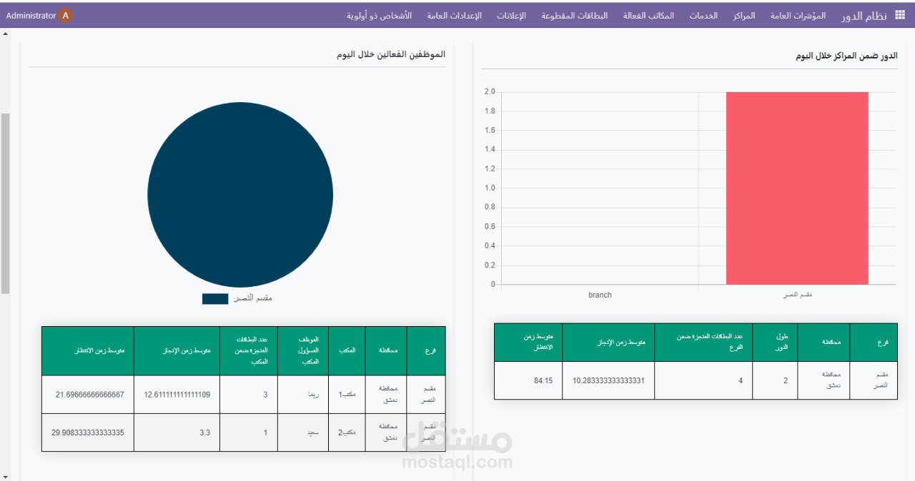•واجهة المؤشرات العامة : عدد البطاقات المخدمة والملغاة والمحولة وغير المخدمة بشكل يومي ,أطول دور لكافة الافرع ,اكثر خدمة متداولة ضمن الافرع ,عدد الموظفين الفعالين في كل فرع