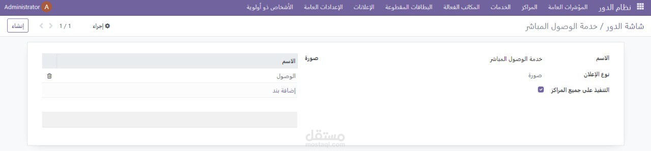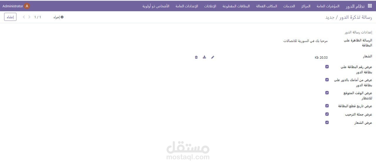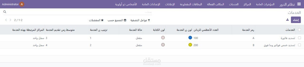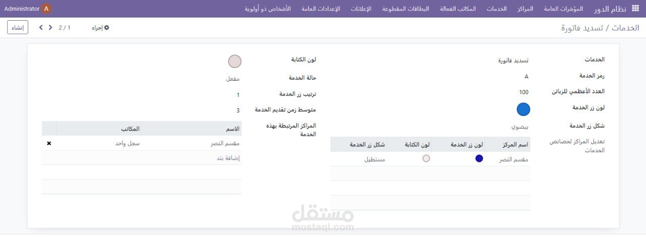 •يتم فيها تحديد اسم الخدمة , وصف الخدمة , الترتيب على الشاشة , الشكل على الشاشة , لون الزر , طول الدور الأعظمي , لون الخط , الأفرع