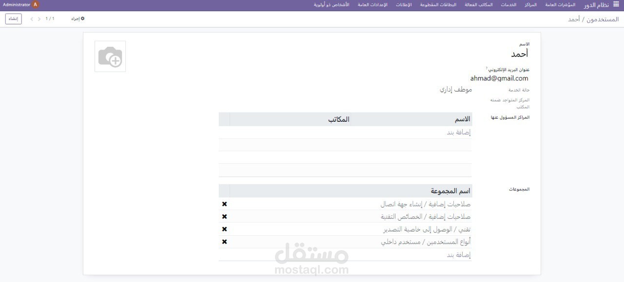•يتم تحديد صلاحيات كل موظف اداري , اسم المستخدم , كلمة المرور , البريد الالكتروني