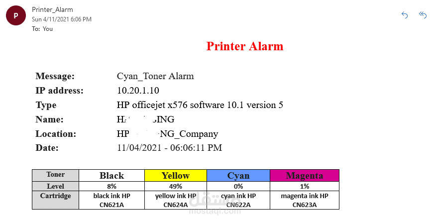 can develop customized application to monitor Network printers availability,color toners status, color toners model and raise alarm when toner level is begin to lower also send alarm email to IT Admin
