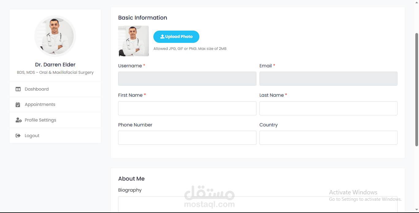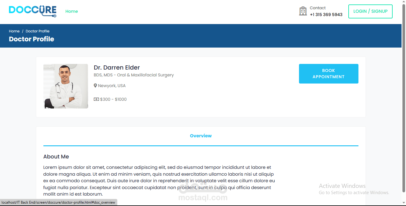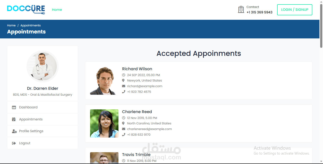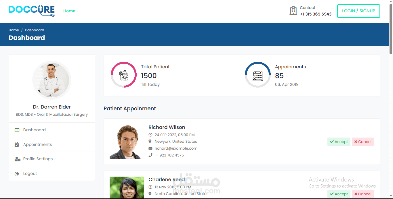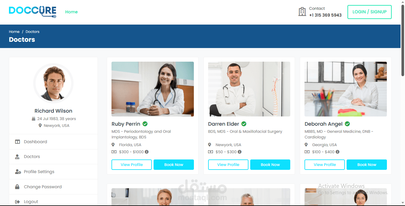 ثم يدخل مباشرة الى لوحة التحكم Dashboard الخاصة بالمرضى حيث يمكنه من خلالها الانتقال الى قسم الاطباء في العيادة او المستشفى واختيار والطبيب المناسب له كما يمكنه تفحص صفحة الطبيب الشخصية ورؤية معلوماته وانجازاته .