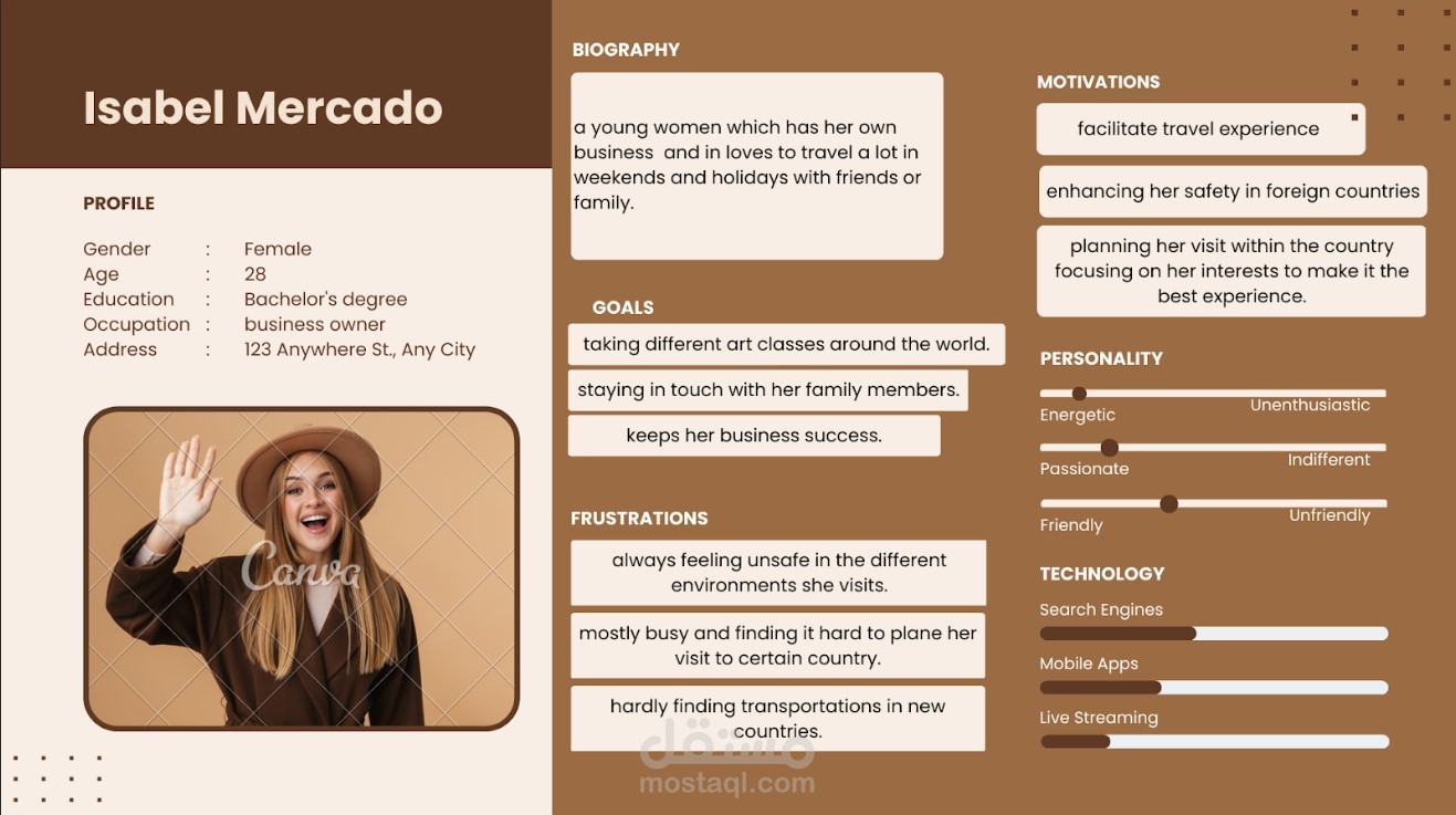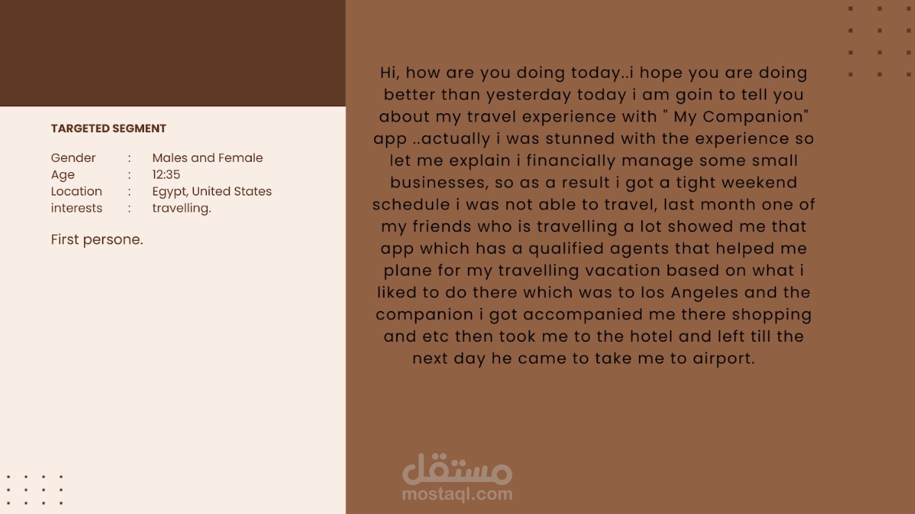 عملت buyer persona من targeted audience لفكرة مشروع my companion و اللي عباره عن تطبيق بيسمحلك تحجز مرافقين ليك في دول محدده و بيعرفو يتكلمو لغات محدده على حسب لغة المستفيد و البلد اللي هيروحها او فيها