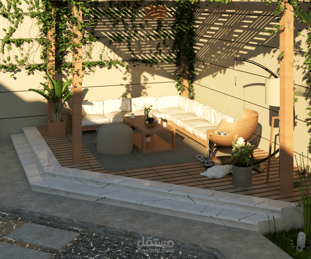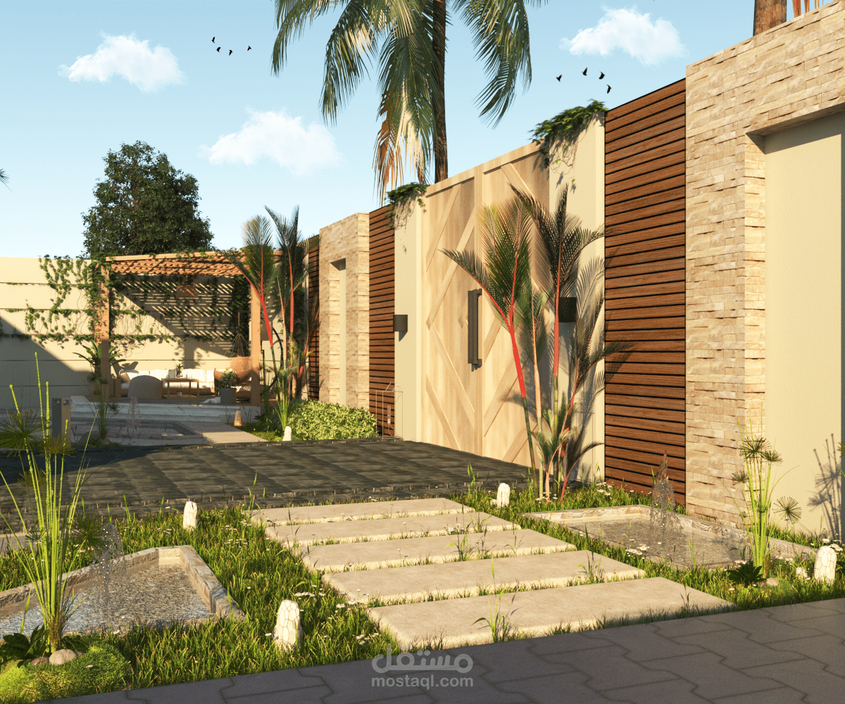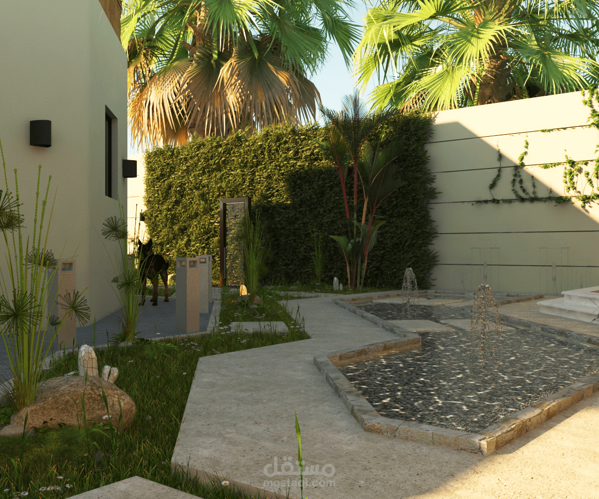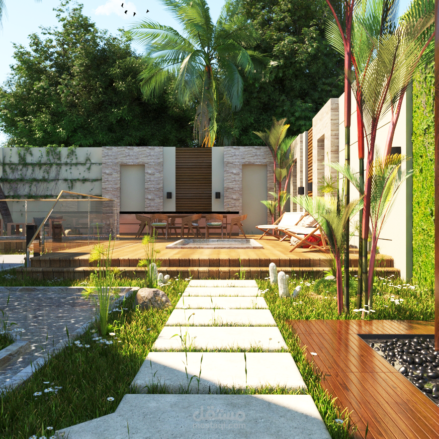 تصميم لانسكيب حول فيلا بموقع الرحاب حيث يتكون من حمام سباحة و منطقة طعام و شواء و منطقة مظللة للجلوس و منطقة جراج للسيارة بجانب العديد من المساحات الخضراء و الشجيرات.