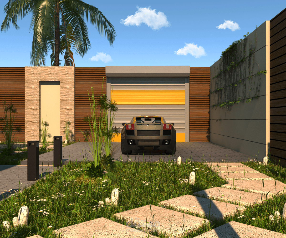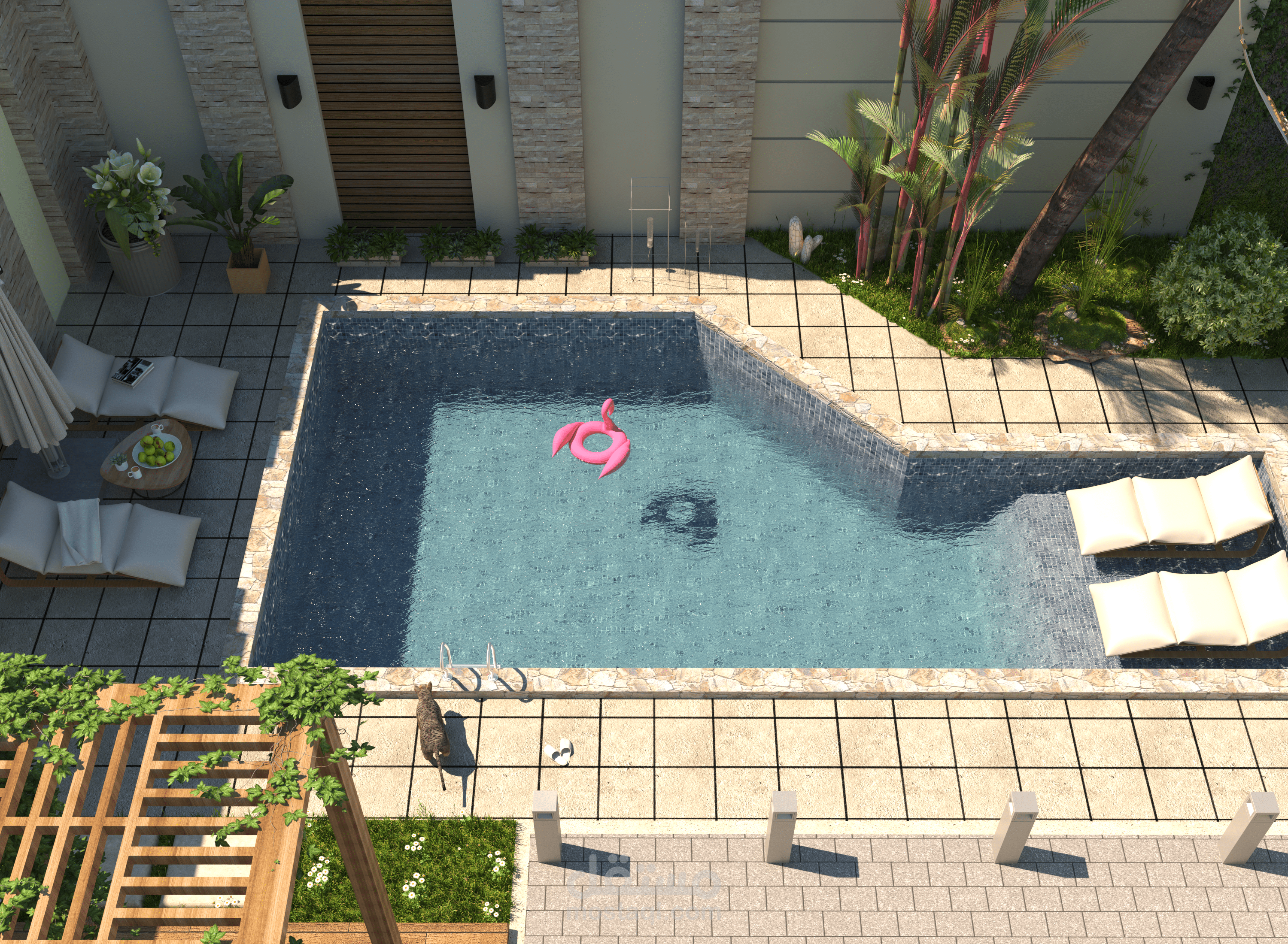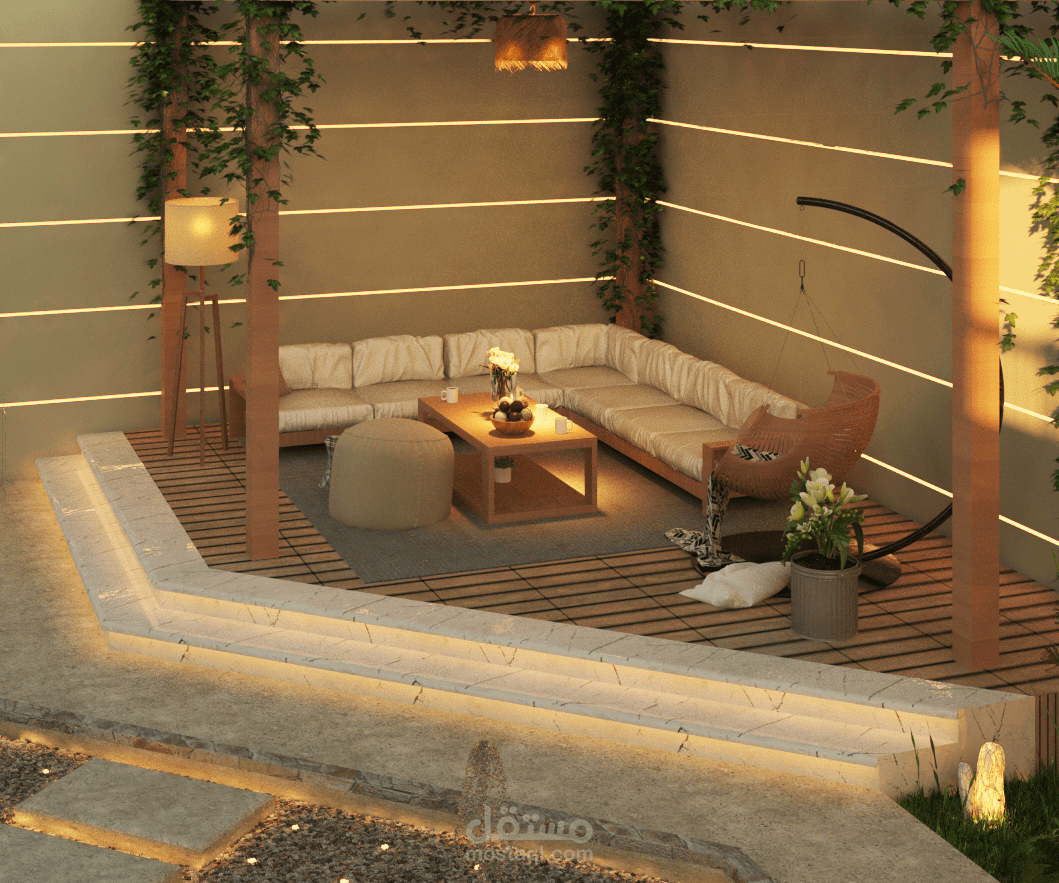 تصميم لانسكيب حول فيلا بموقع الرحاب حيث يتكون من حمام سباحة و منطقة طعام و شواء و منطقة مظللة للجلوس و منطقة جراج للسيارة بجانب العديد من المساحات الخضراء و الشجيرات.