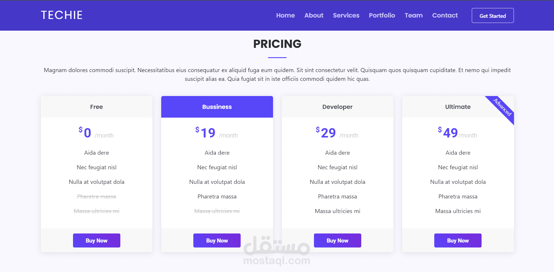 تطبيق ويب يعرض معلومات عن شركة البرمجيات مثل الخدمات والأعمال والميزات والأسعار ومعلومات عن الفريق.