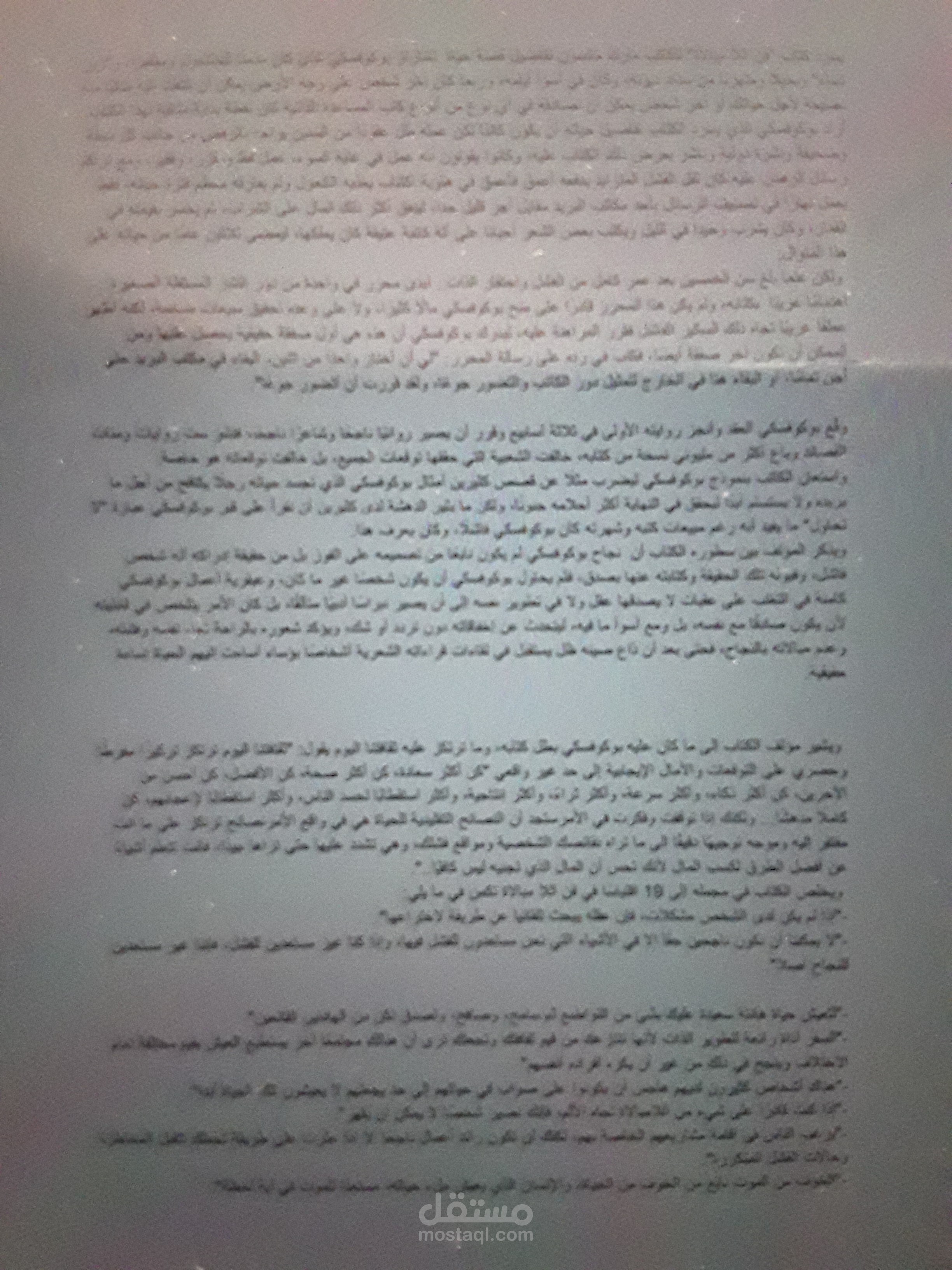 ويذكر المؤلف بين سطوره الكتاب أن نجاح بوكوفسكي لم يكون نابعًا من تصميمه على الفوز بل من حقيقة إدراكه أنه شخص فاشل، وقبوله تلك الحقيقة وكتابته عنها بصدق، فلم يحاول بوكوفسكي أن يكون شخصًا غير ما كان، وعبقرية أعمال بوكوفسكي كامنة في التغلب على عقبات لا يصدقها عقل ولا في تطوير نفسه إلى أن يصير نبراسًا أدبيًا متألقًا، بل كان الأمر يتلخص في قابليته لأن يكون صادقًا مع نفسه، بل ومع أسوأ ما فيه، ليتحدث عن إخفاقاته دون تردد أو شك، ويؤكد شعوره بالراحة تجاه نفسه وفشله، وعدم مبالاته بالنجاح، فحتى بعد أن ذاع صيته ظل يستقبل في لقاءات قراءاته الشعرية أشخاصًا بؤساء أساءت إليهم الحياة إساءة حقيقية.