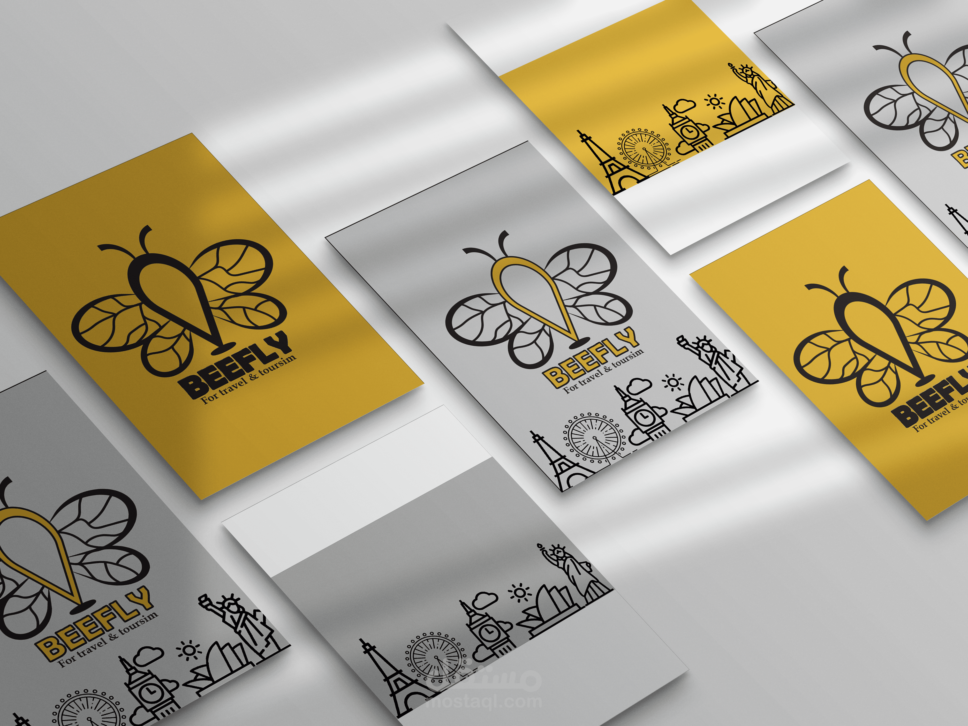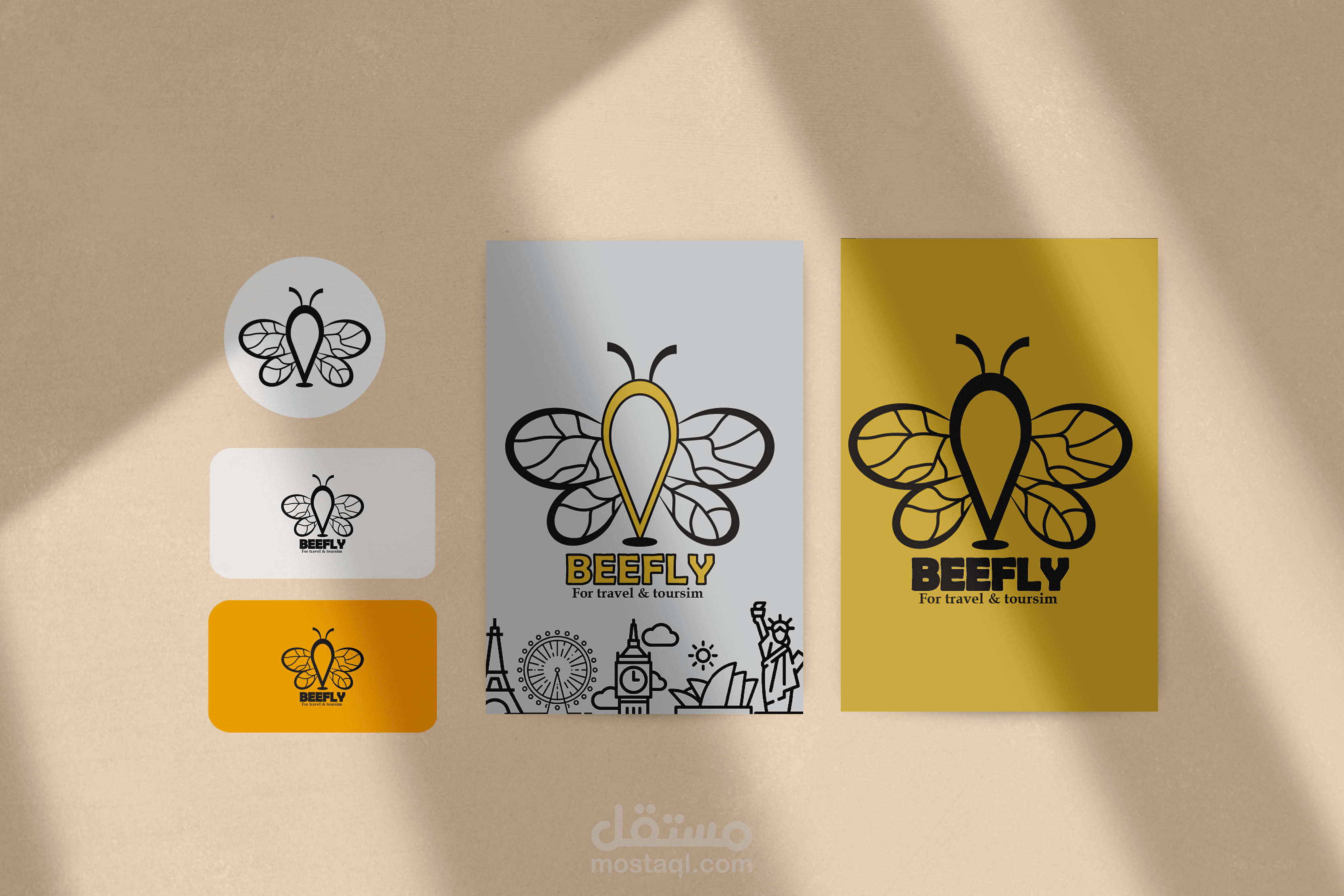 تصميم شعار وهوية لشركة بأسم BEEFLY مختصة بالسياحة والسفر تم الاعتماد بالتصميم عللى المج بين أجنحة النحل و شعار الموقع للوصول للنتيجة النهائية