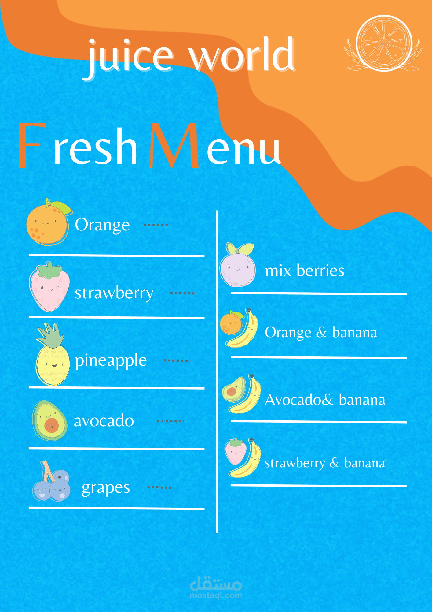تصميم شعار وقائمة للمشروبات لمحل عصائر بشكل عصري ومميز بما يتناسب مع اسم المكان والوان الديكور الخاصة به بأسم JUICE WORLD